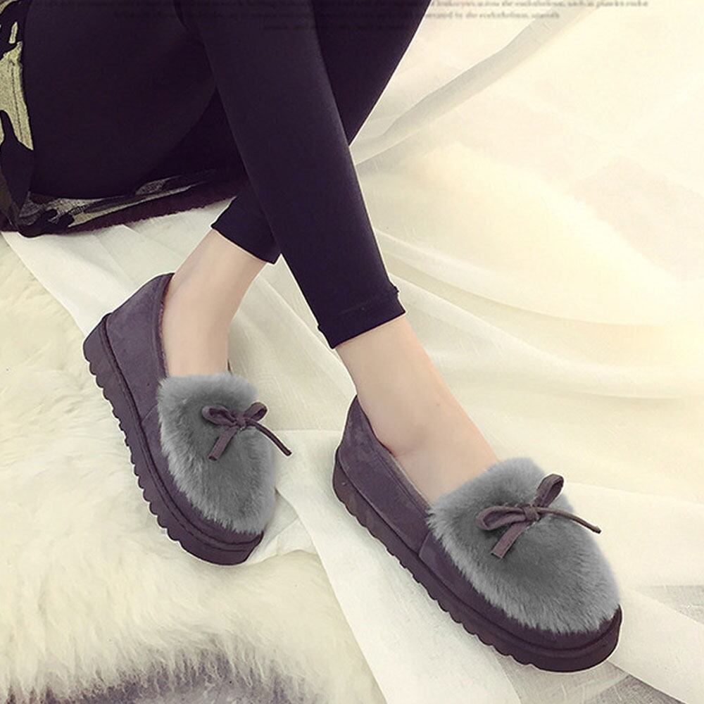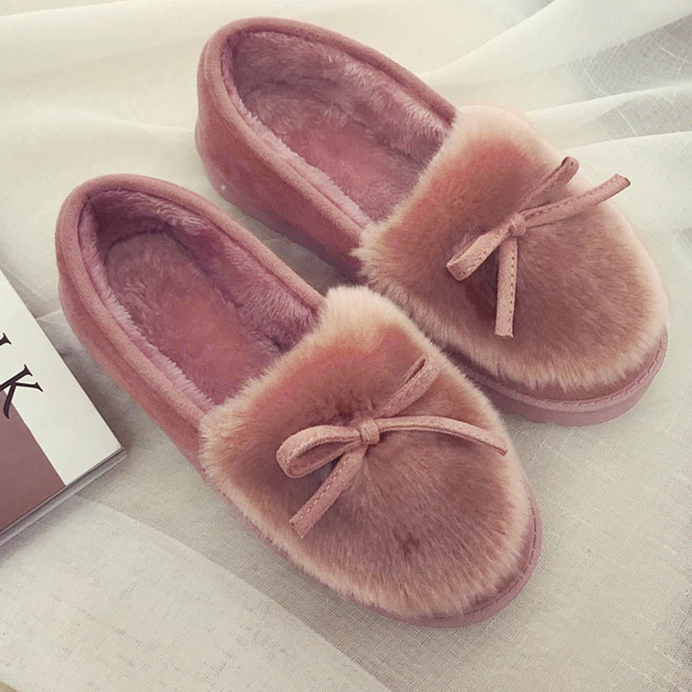 ふんわりボリュームのあるフェイクファーに可愛いリボンのぺたんこパンプス