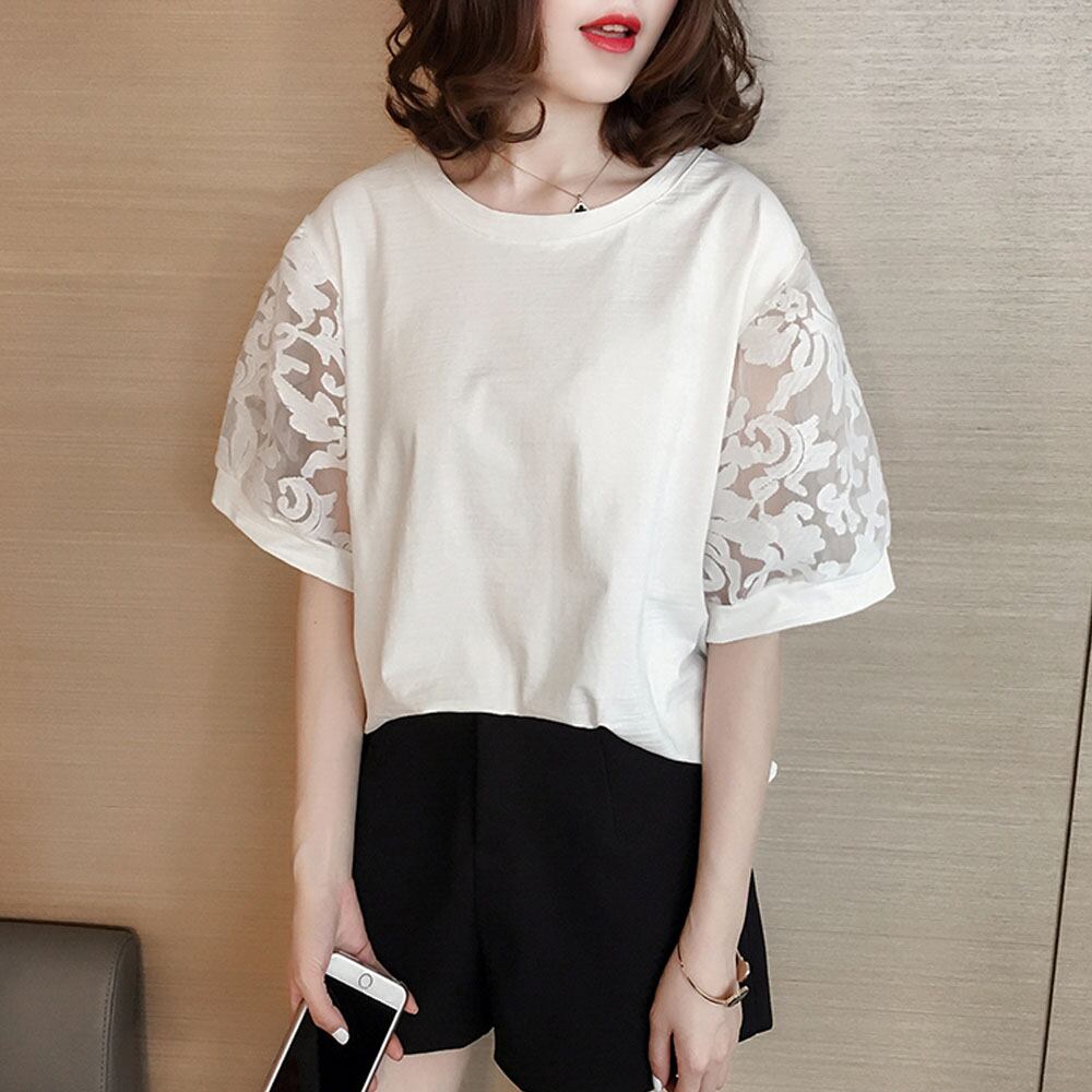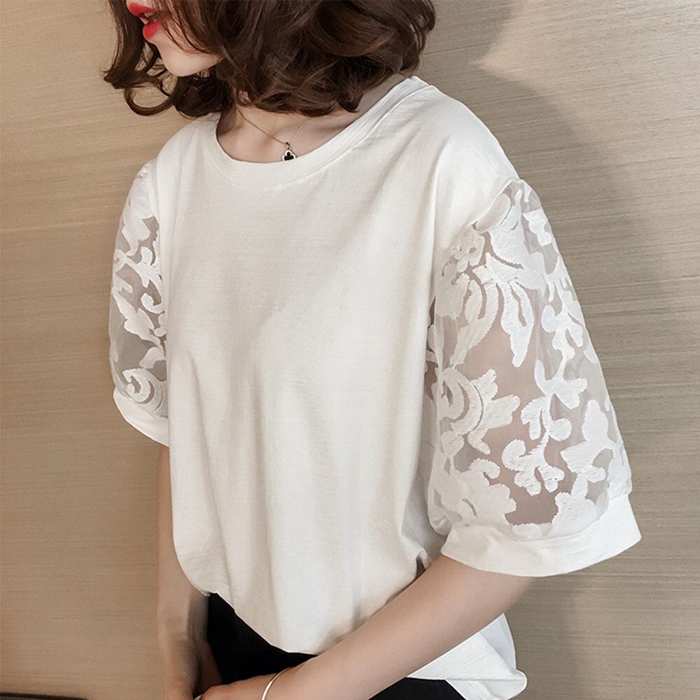刺しゅうレース切り替えデザインで華やかな雰囲気を与えてくれる刺しゅうチュールカットソー