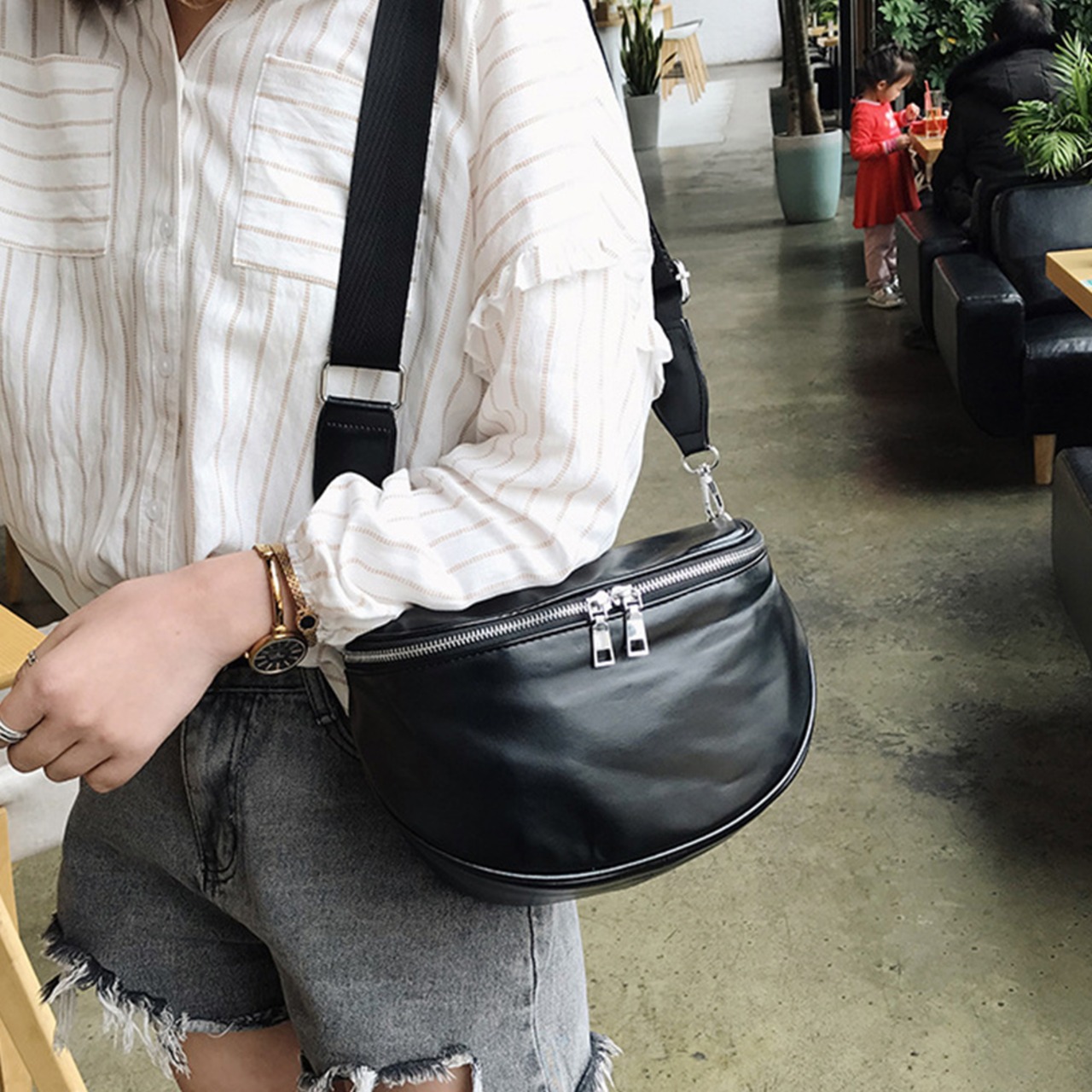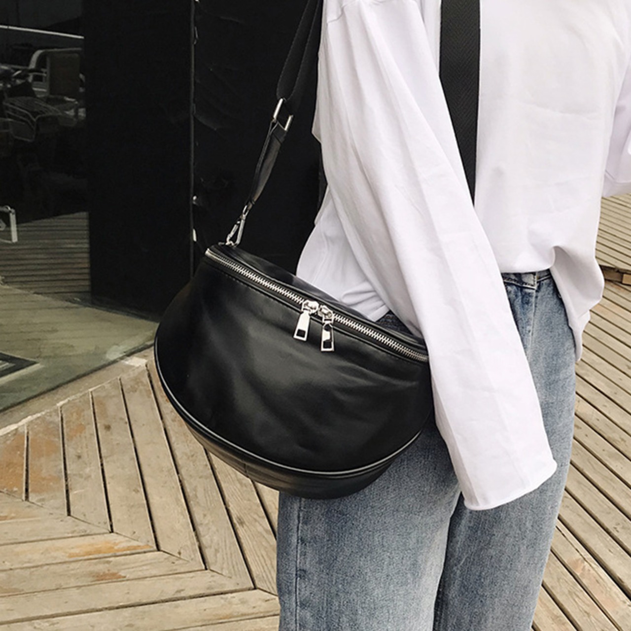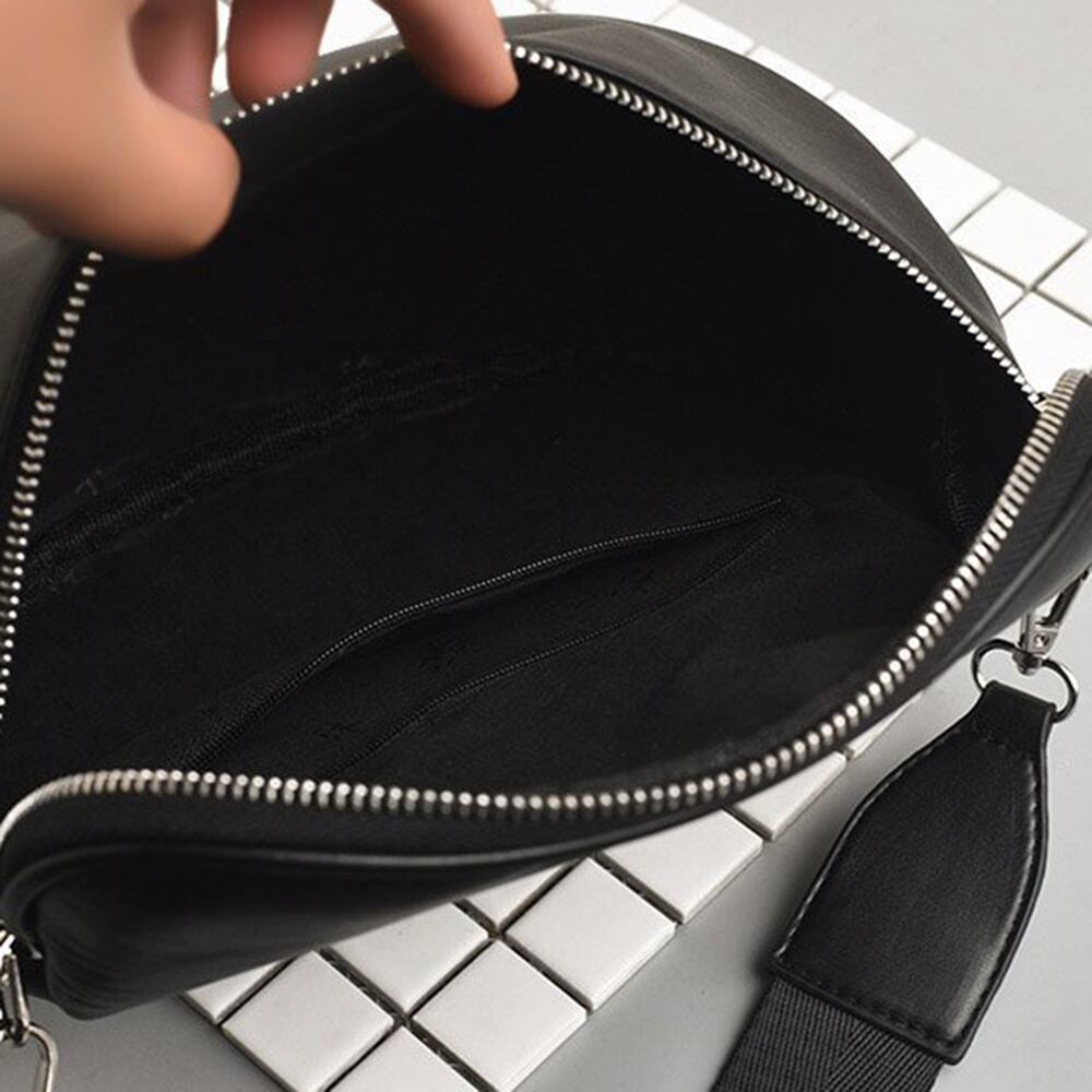 大きく開く開閉口なので物を取り出しやすく、収納しやすいレザーボディバッグ