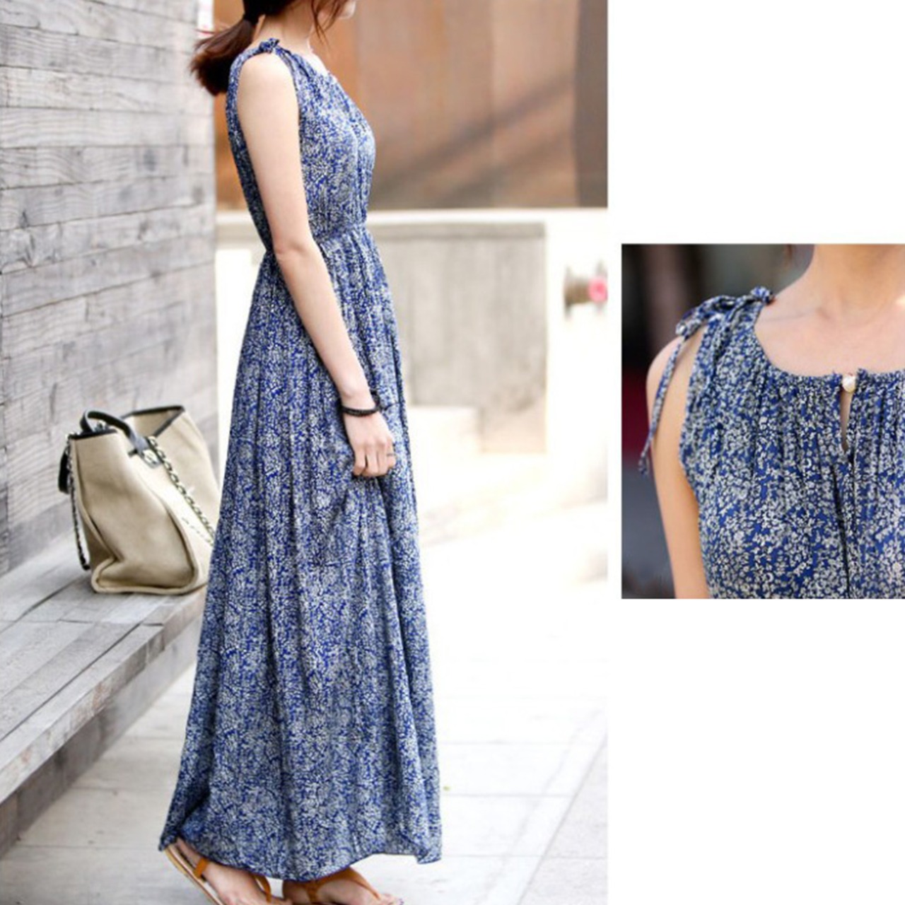 爽やかな夏らしい花柄ノースリーブワンピースはリゾートにぴったり