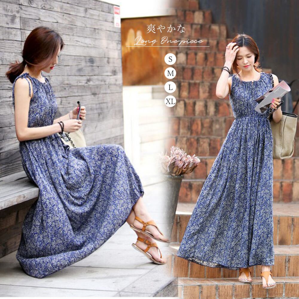 ロングワンピース ノースリーブ レディース 花柄 マキシ丈ワンピース 薄手