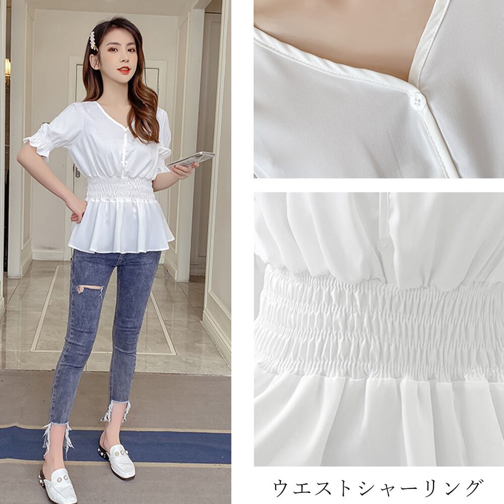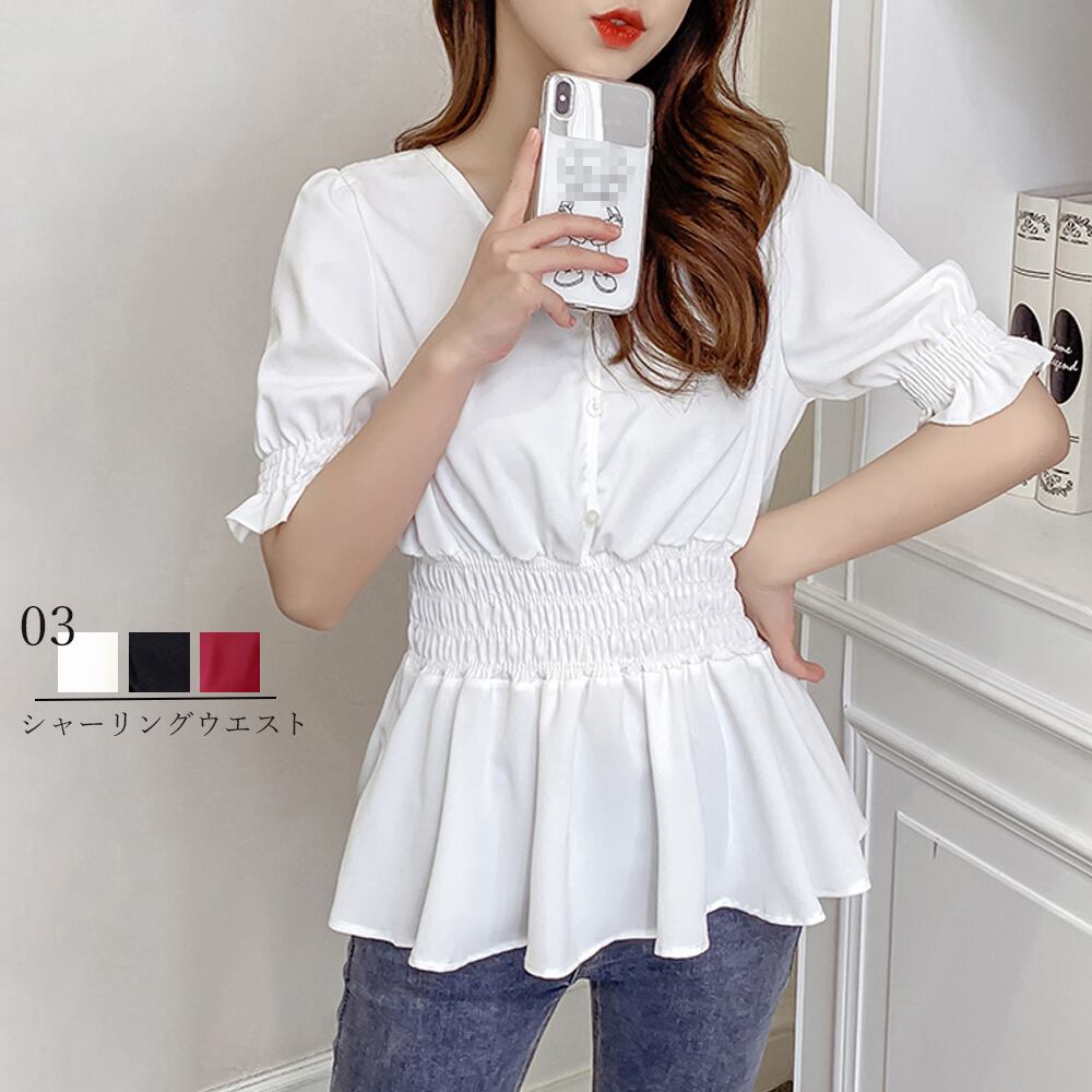 シャツ シャーリング カットソー パフスリーブ 体型カバー トップス シフォン 夏 半袖 カジュアル