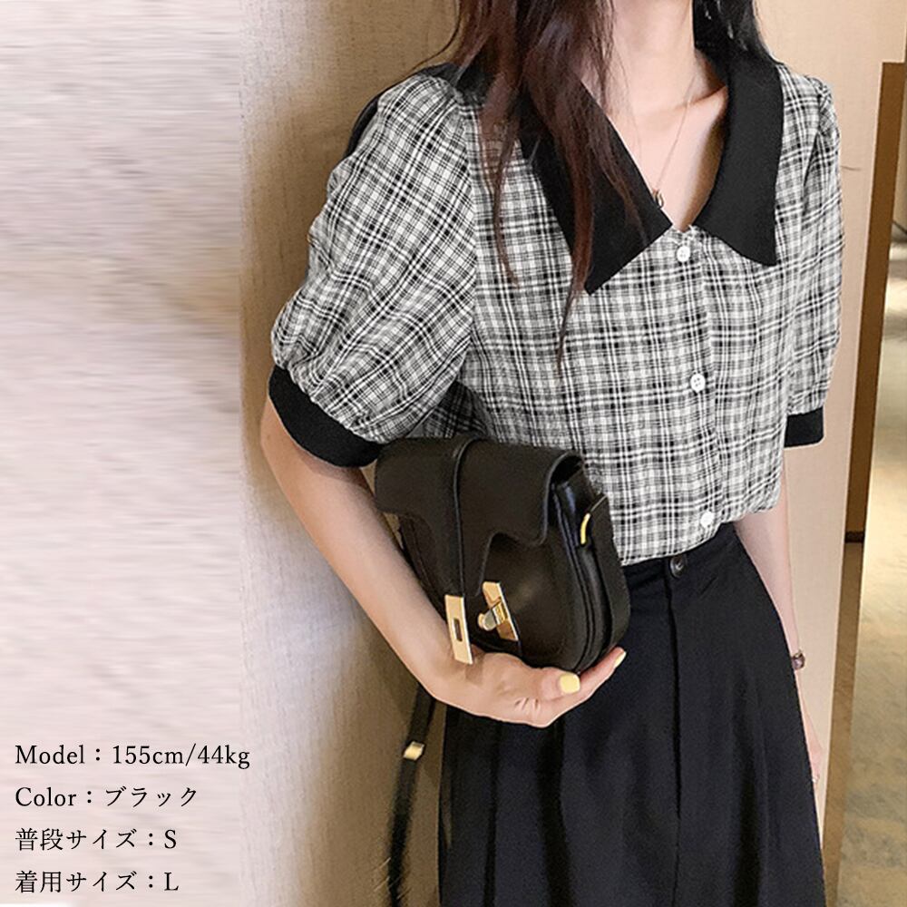 パフスリーブ 半袖 レディース トップス 5分袖 襟付き 大人可愛い きれいめ 韓国ファッション