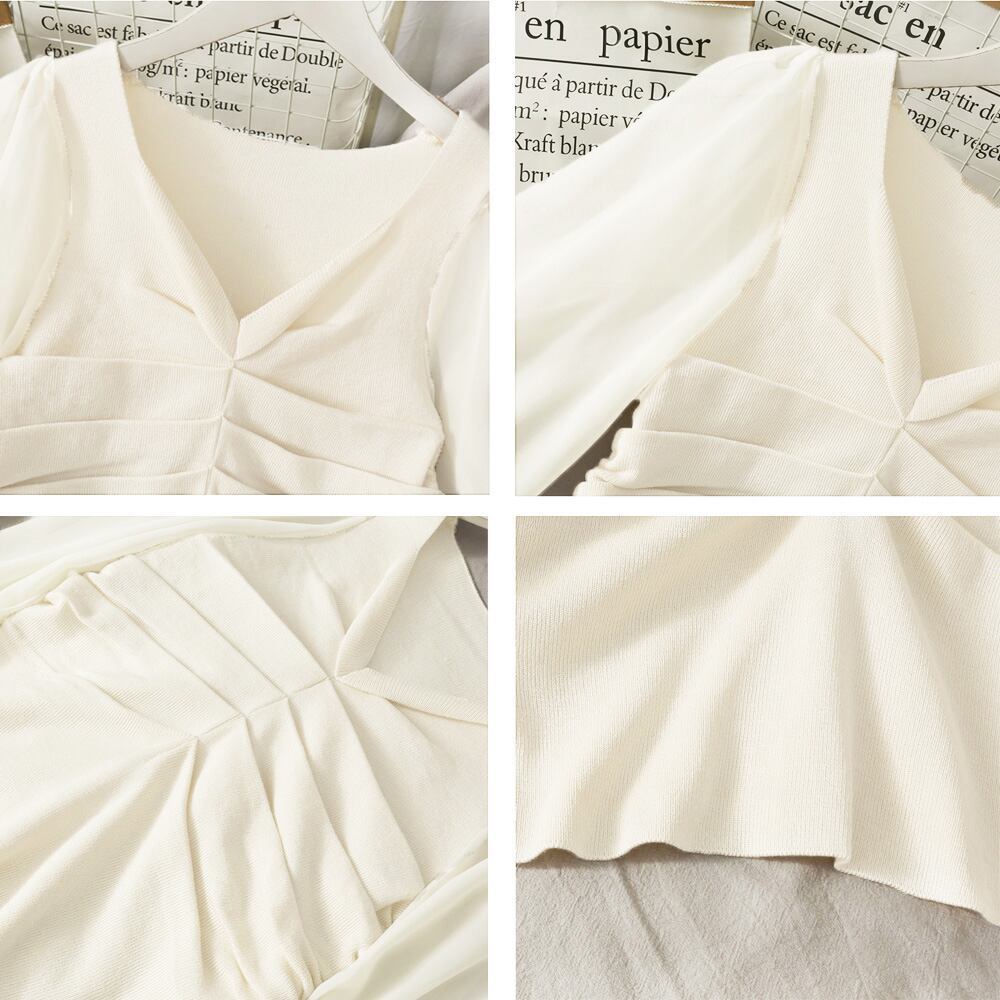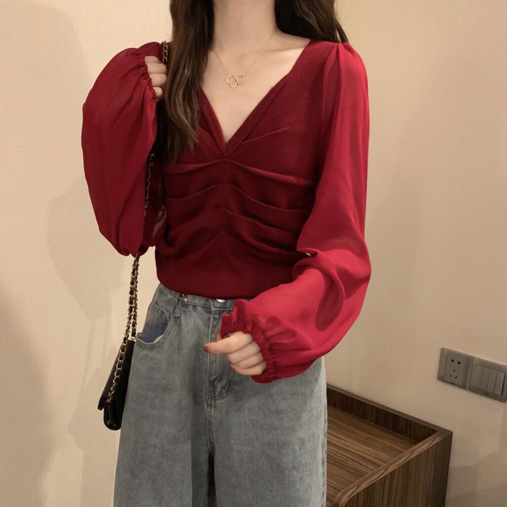 ニットトップス シャツブラウス Vネック ドッキング 透け感 袖切り替え ニットソー 大人可愛い