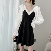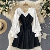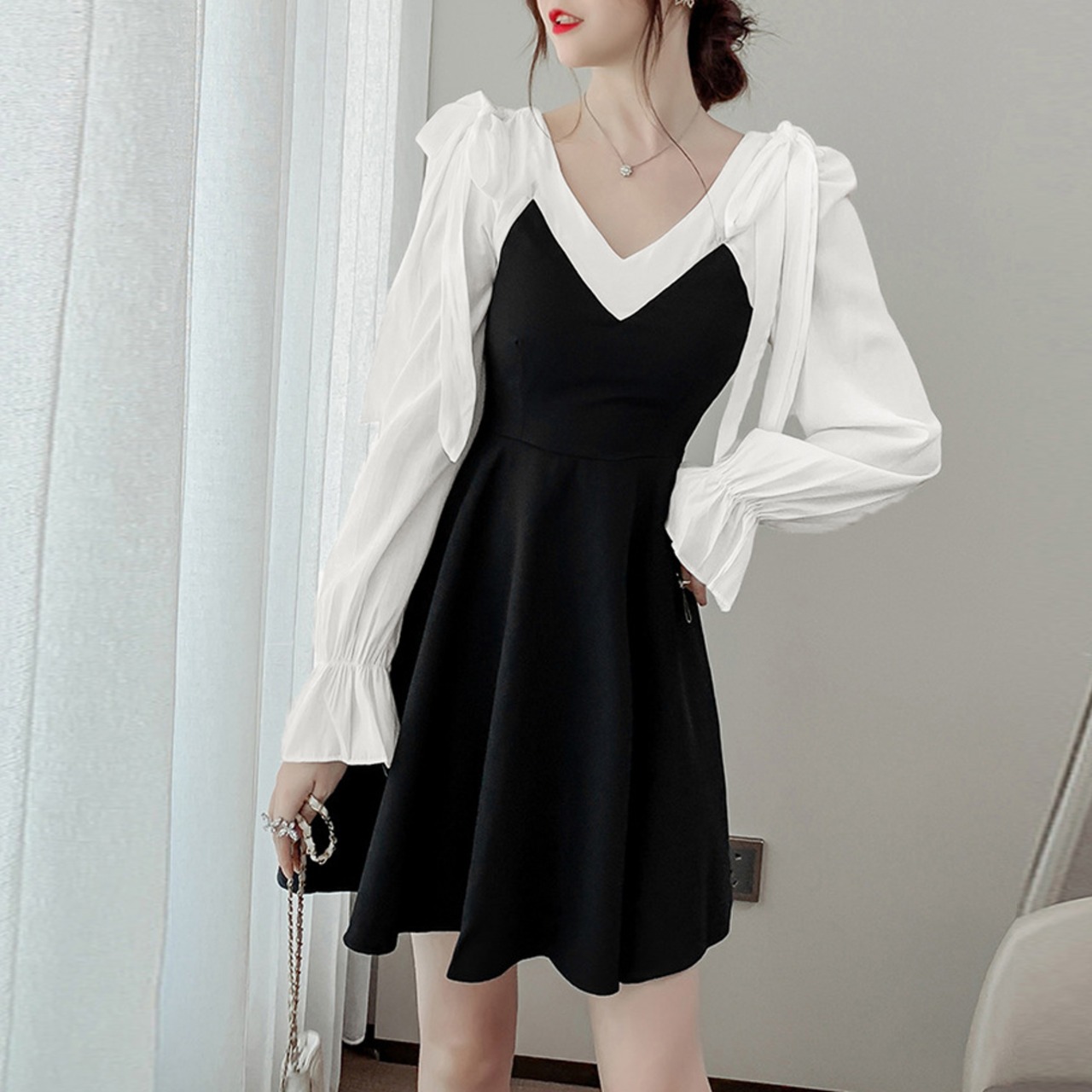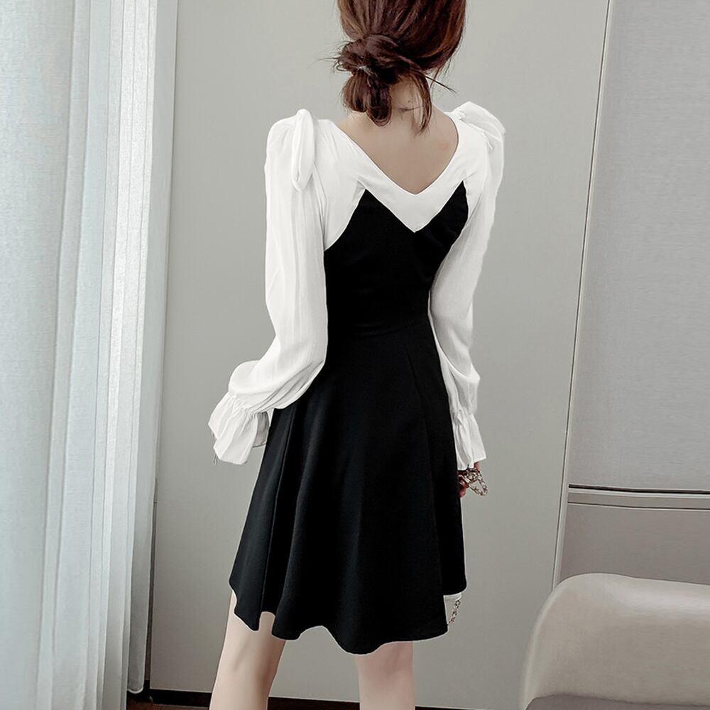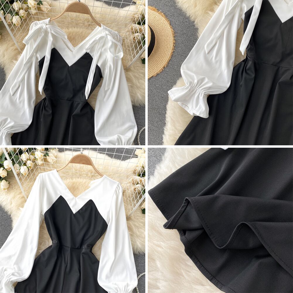 肩リボン付きとパフスリーブ、切り替えの重ね着風デザインワンピース