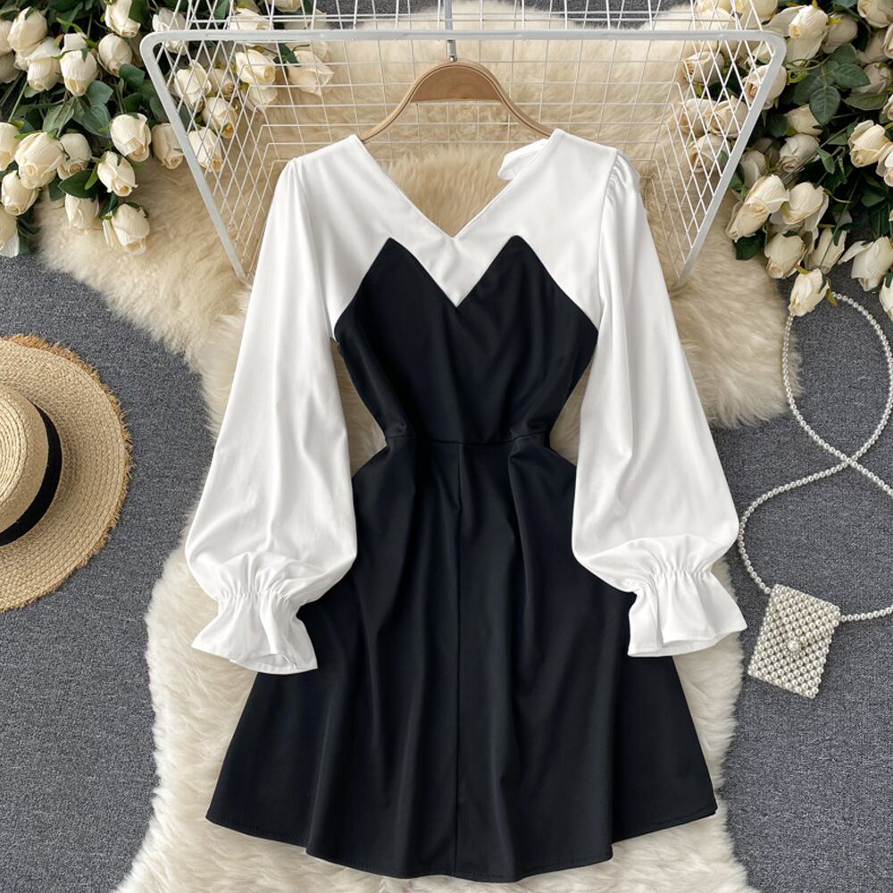 Aラインワンピース 重ね着風 チュニックワンピース エレガント パフスリーブ 膝上丈ワンピース きれいめ
