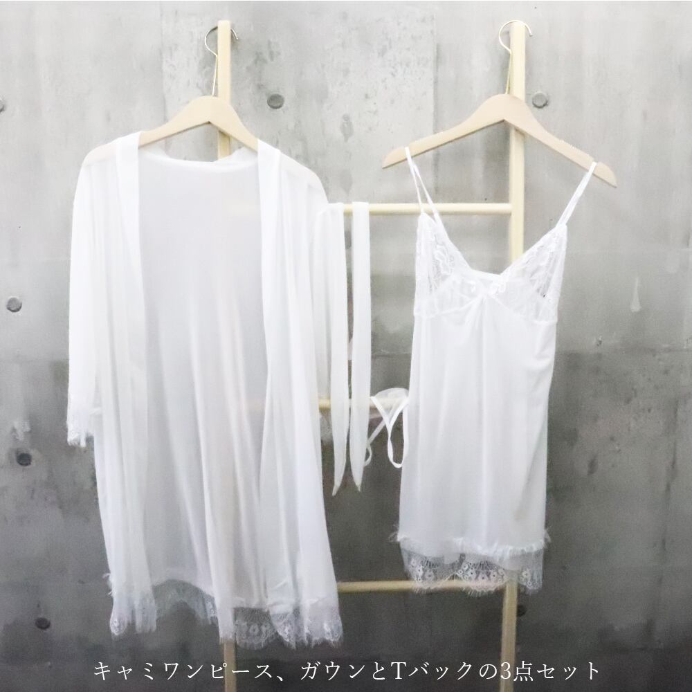 セクシーなシアーチュールで仕上げたキャミワンピース、ガウンとTバックの3点セットです