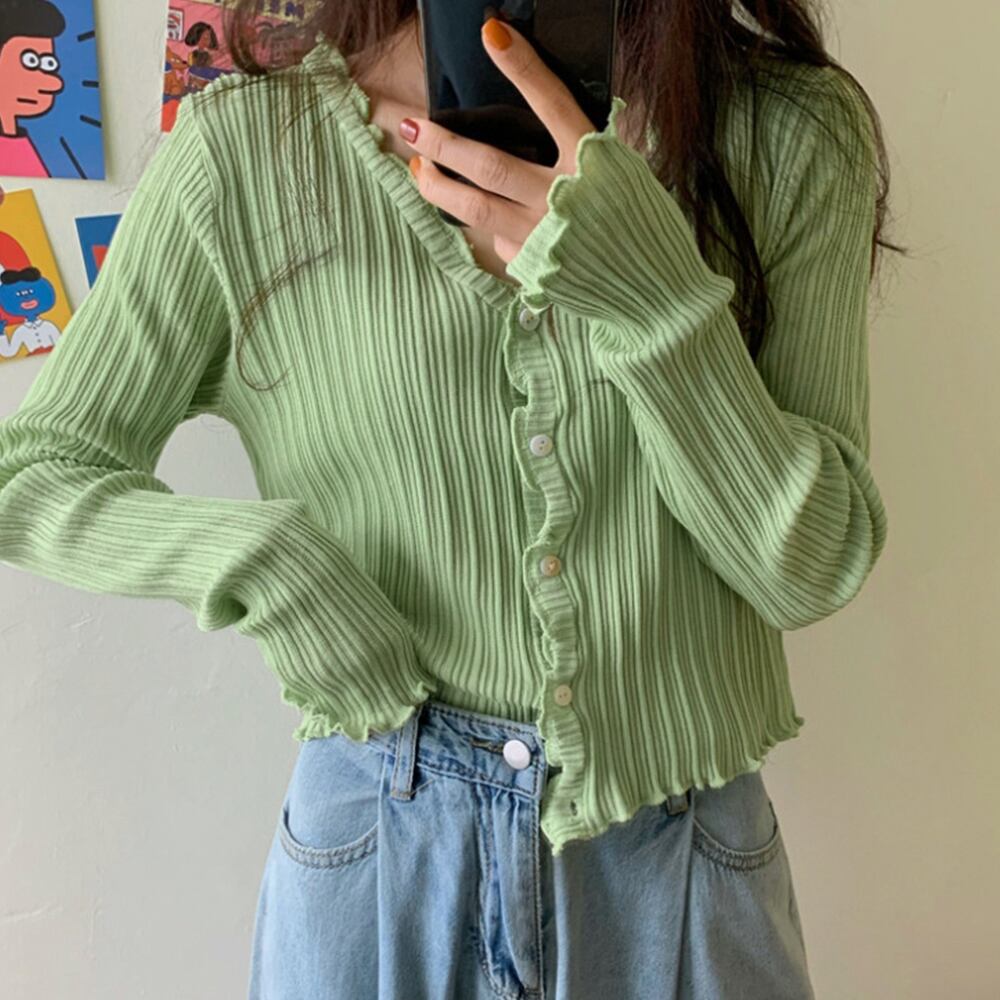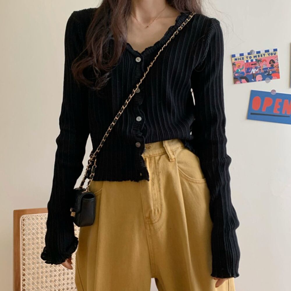 リブショートカーデ Vネック フリル 長袖 きれいめ お出かけ アウター ショート丈 かわいい 大人カジュアル 通学 20代