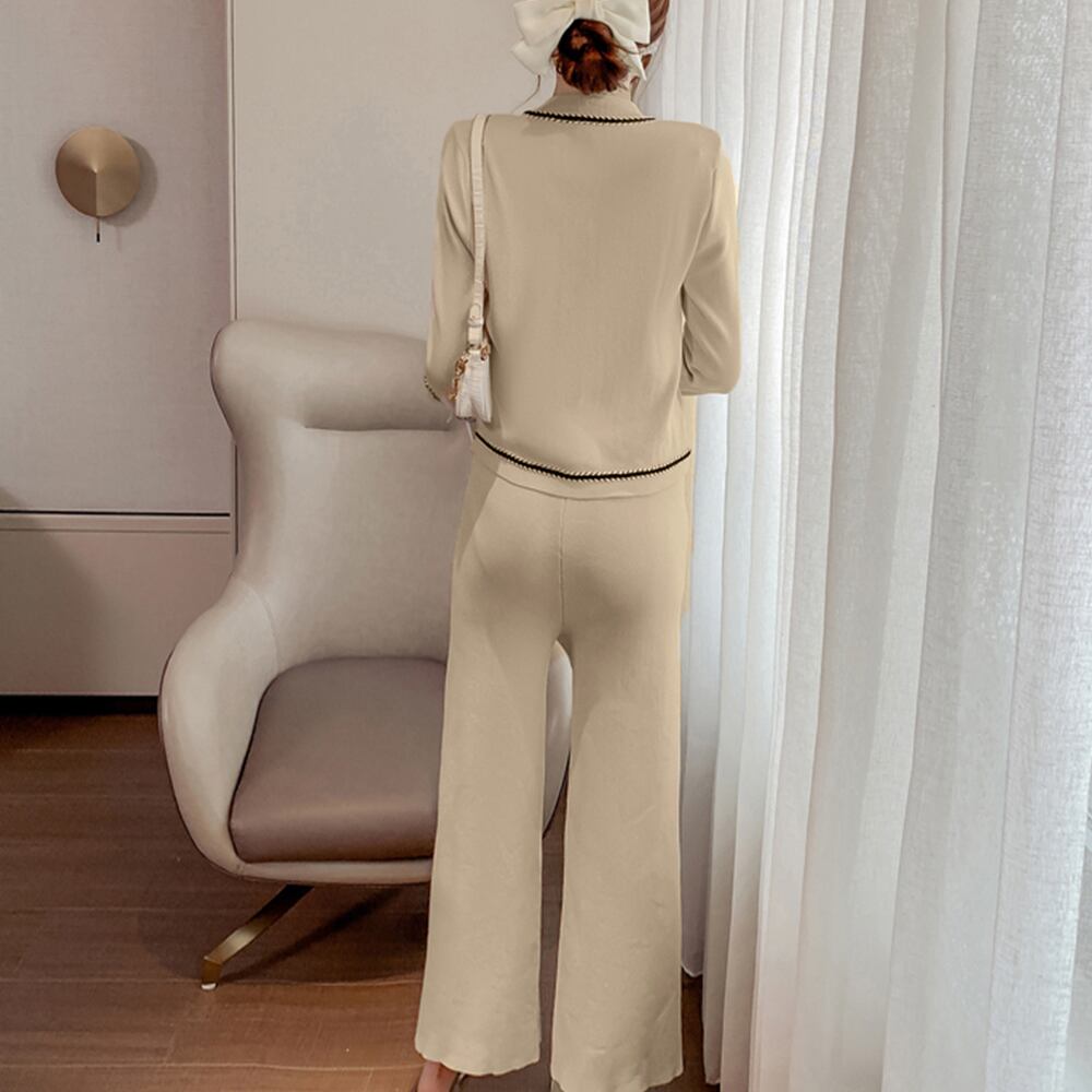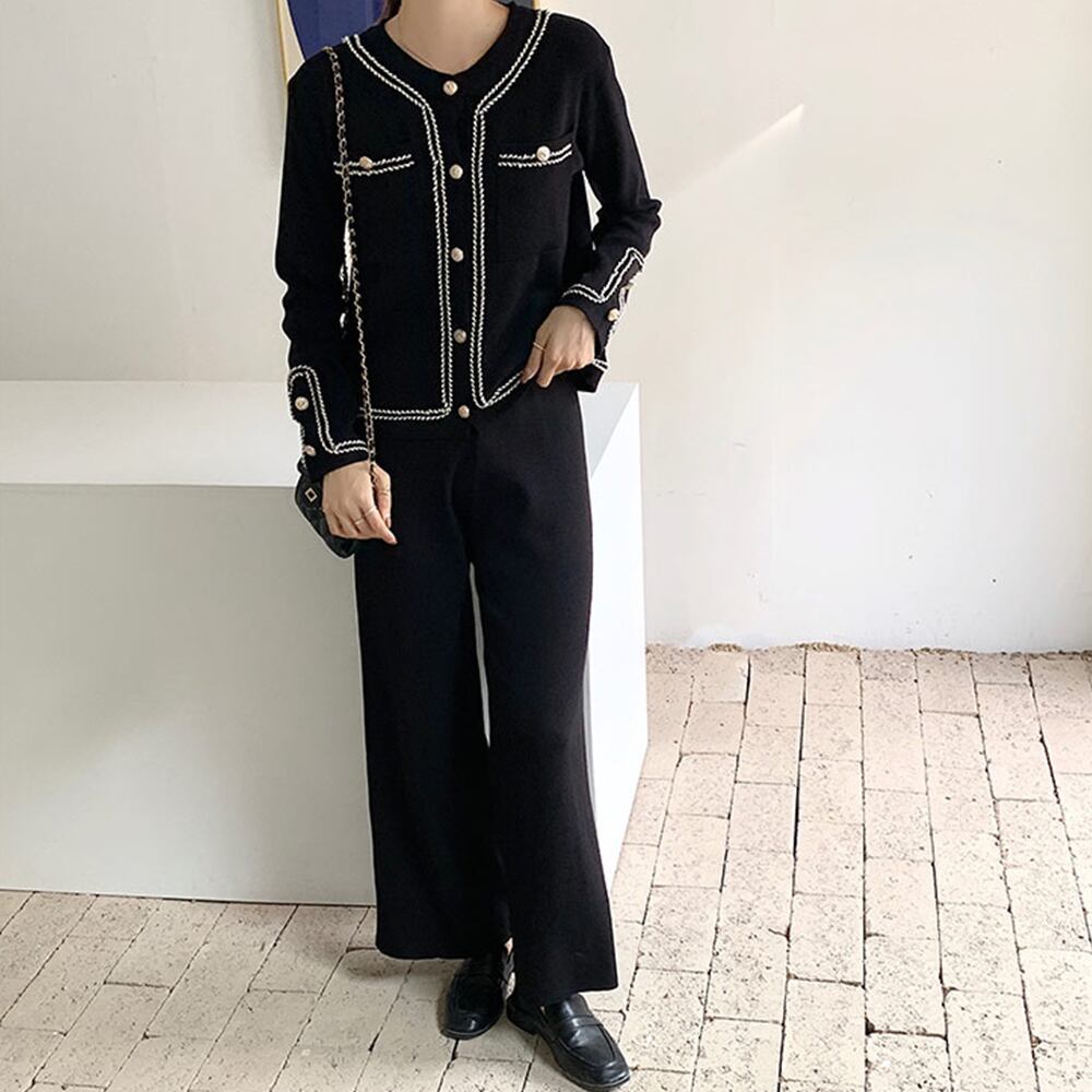モノトーンの配色ステッチがトレンド感抜群、レトロな雰囲気に導くニット生地セットアップ