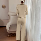 ショート丈ジャケットなので上半身がすっきり見え、ニットパンツは裾フレア仕様で足が細く長く見えてスタイルアップ