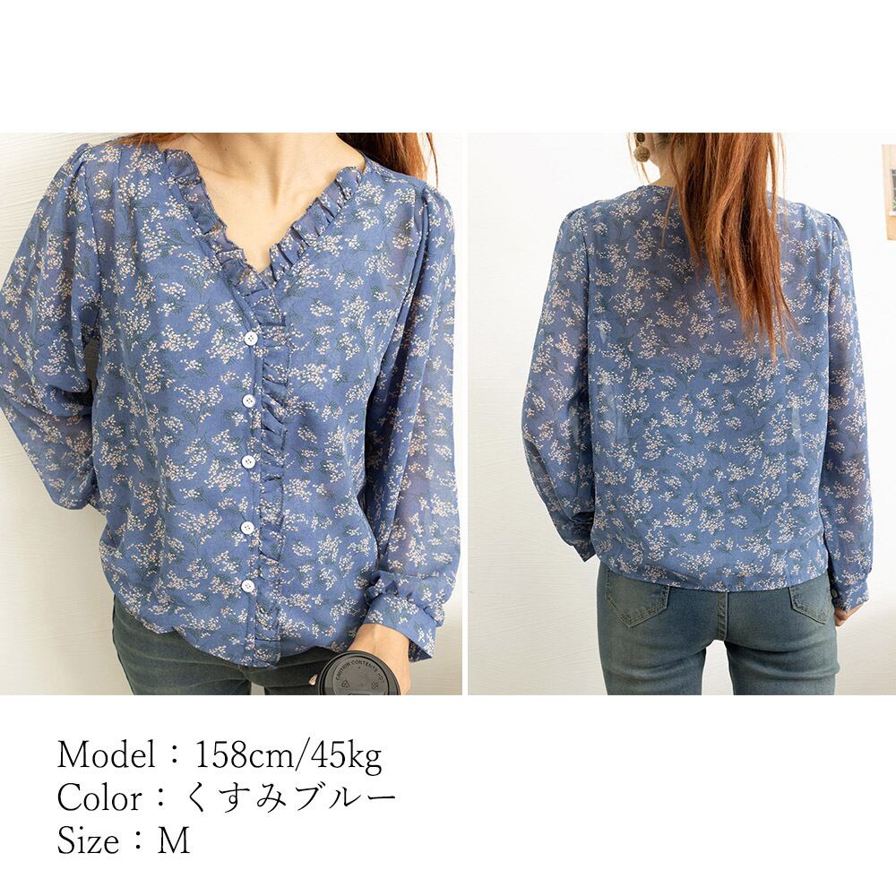 甘すぎないフリルディテールを取り入れた花柄ブラウス。