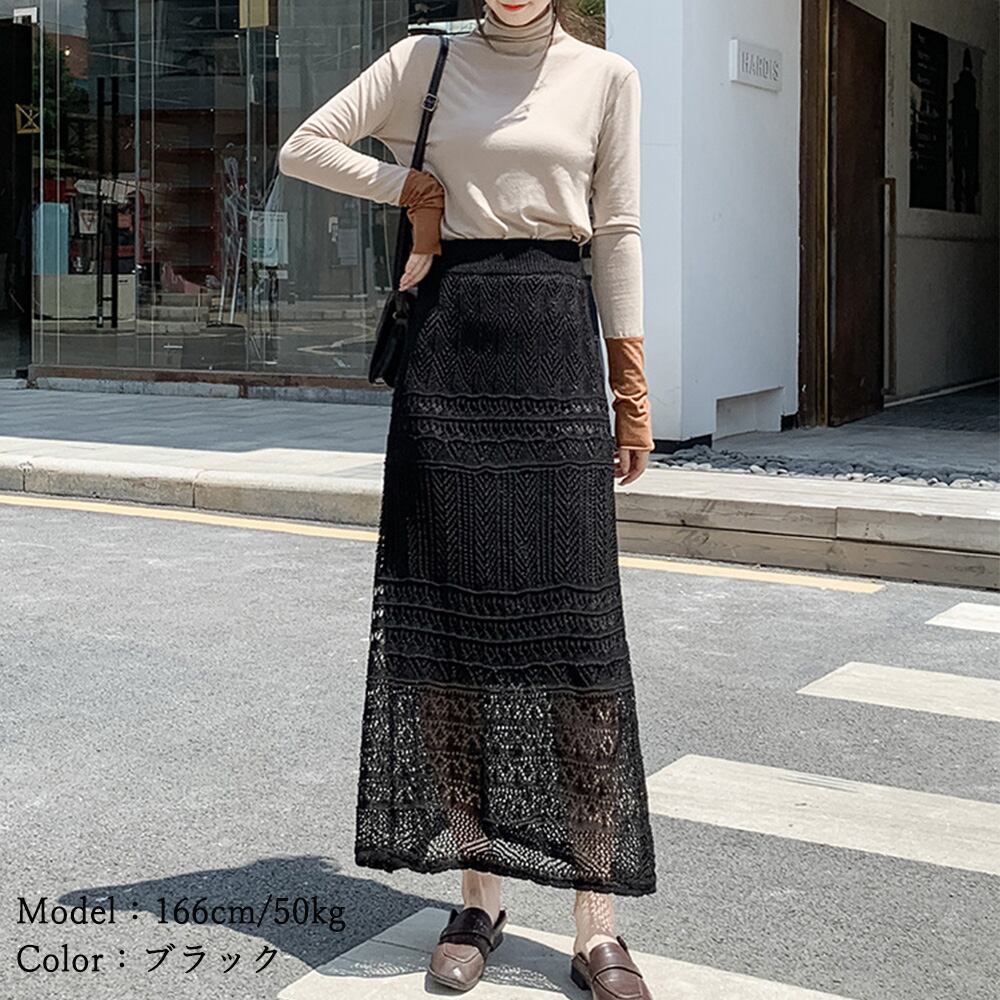 レディース 韓国風 ロングスカート かぎ編み タイトスカート 秋冬 きれいめ ミモレスカート フェミニン 透け感