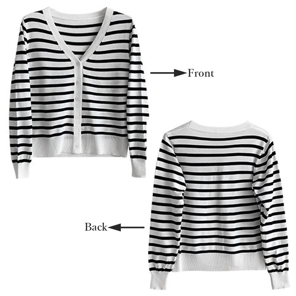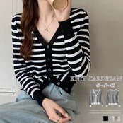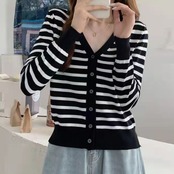 春秋ファッションに欠かせなくレディースボタン付きボーダー柄のニットカーディガン