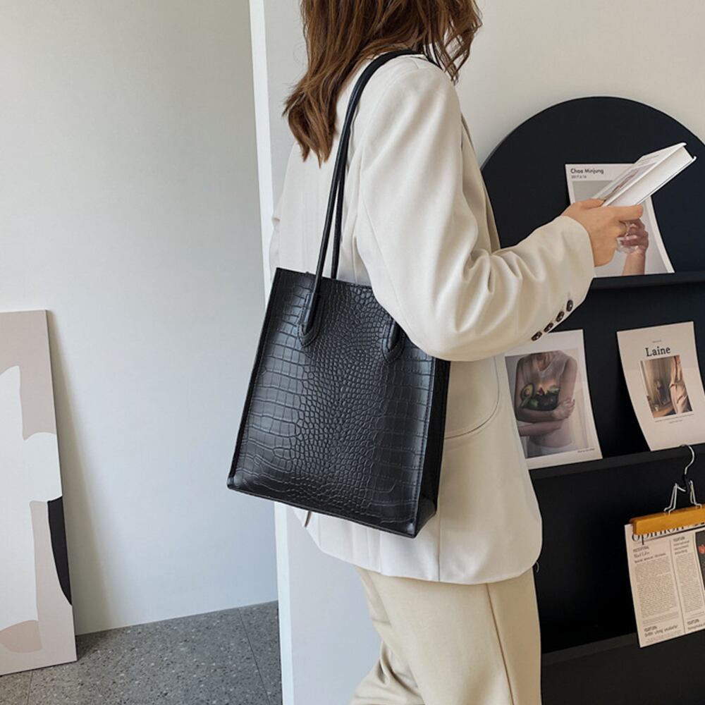 トレンドのスクエアフォルムのクロコ型押しトートバッグ