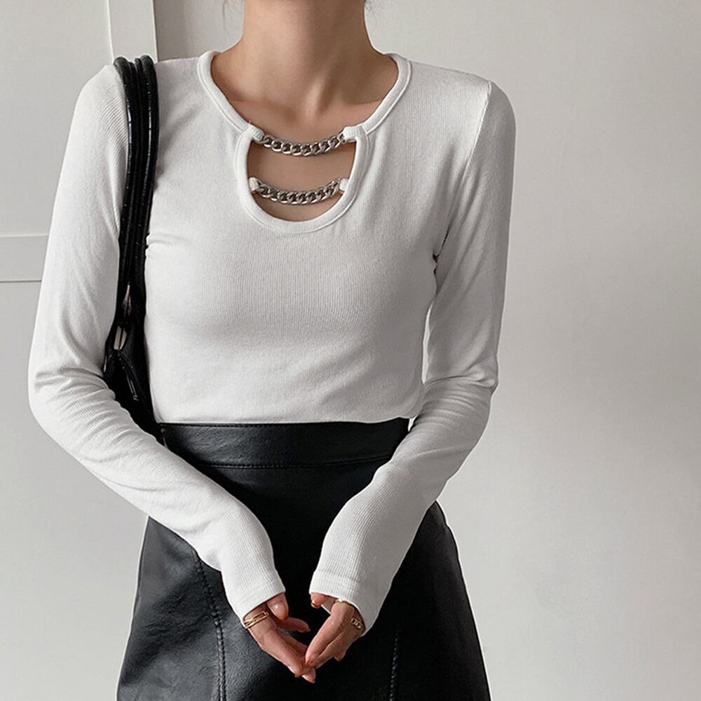 オシャレ チェーン飾り付き カットソー シンプル 無地 トップス オルチャン 着やせインナートップス セクシー