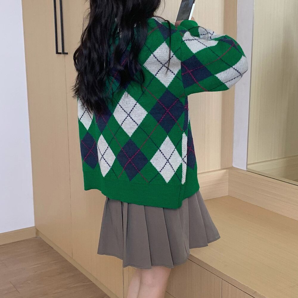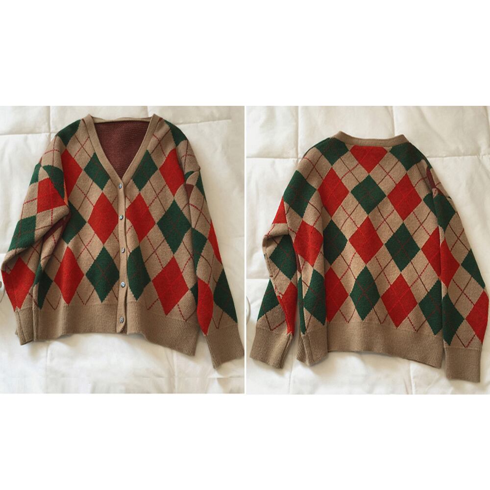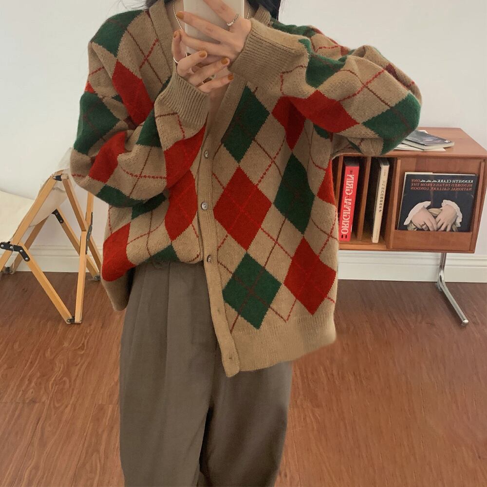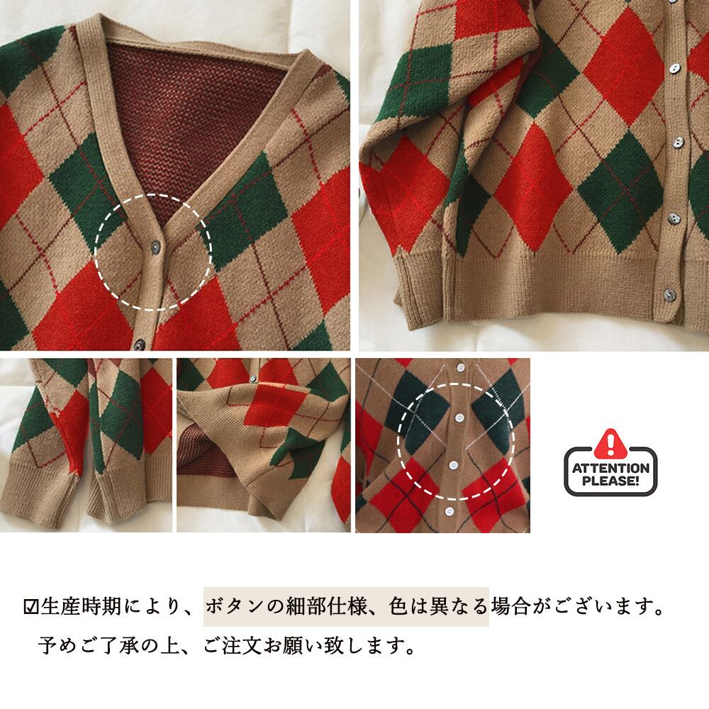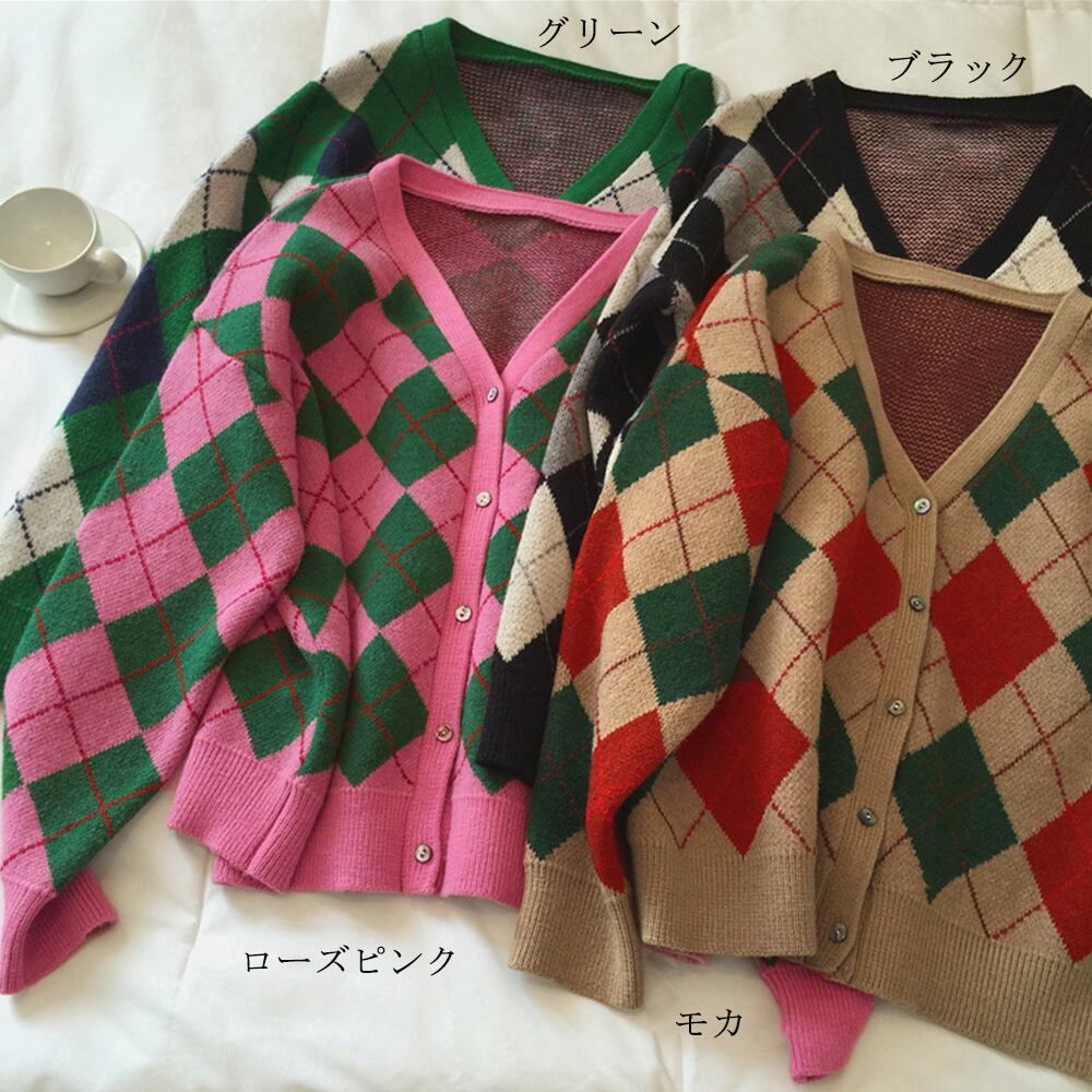 女性らしい綺麗なシルエットを演出してくれるアーガイル柄カーディガン。