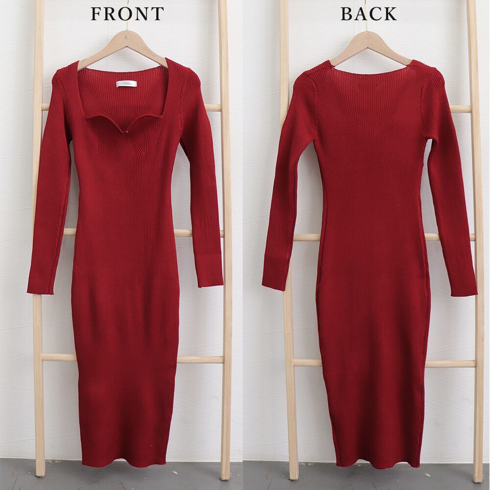 ボディーラインを強調してくれるペンタゴンネックニットワンピース