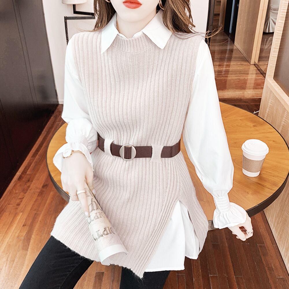 ニットベスト レディース ベルト付き シャーリング袖ブラウス セーター スリット入り 無地 女子会 長袖