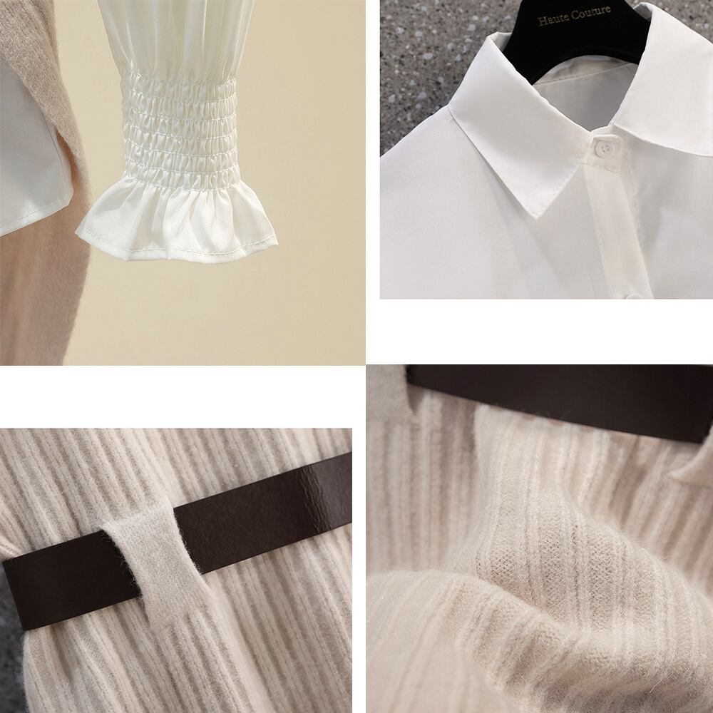 シャーリング袖のブラウス、ニットベストとベルトの3点セットです