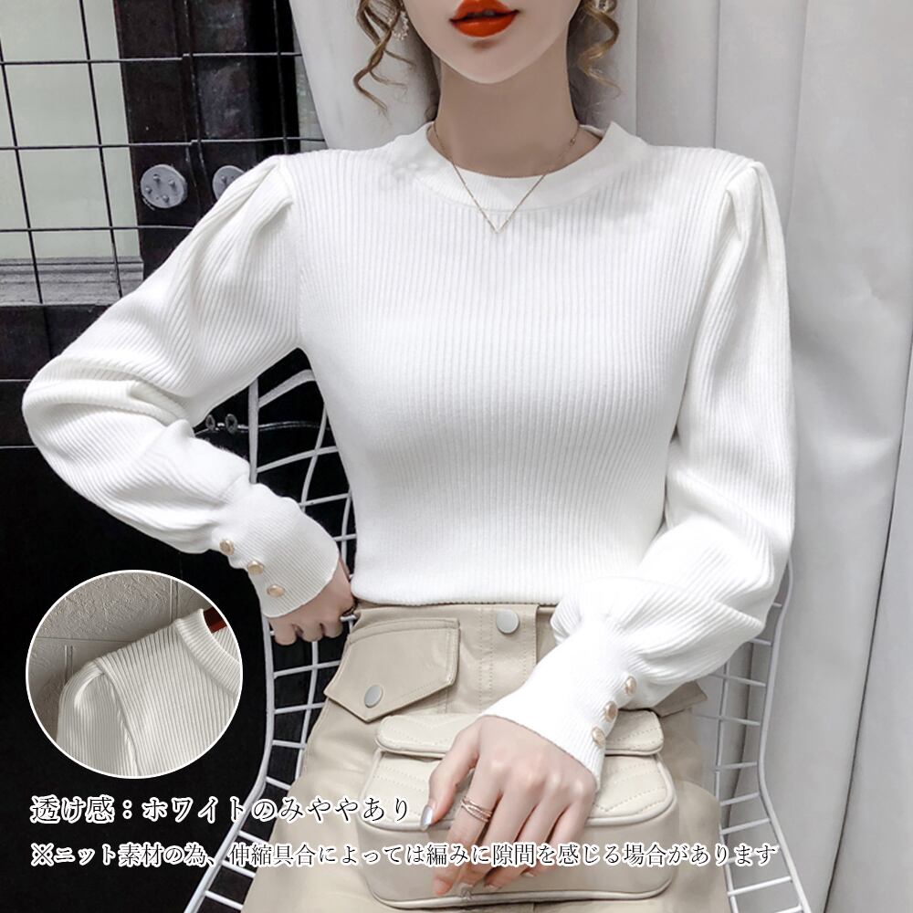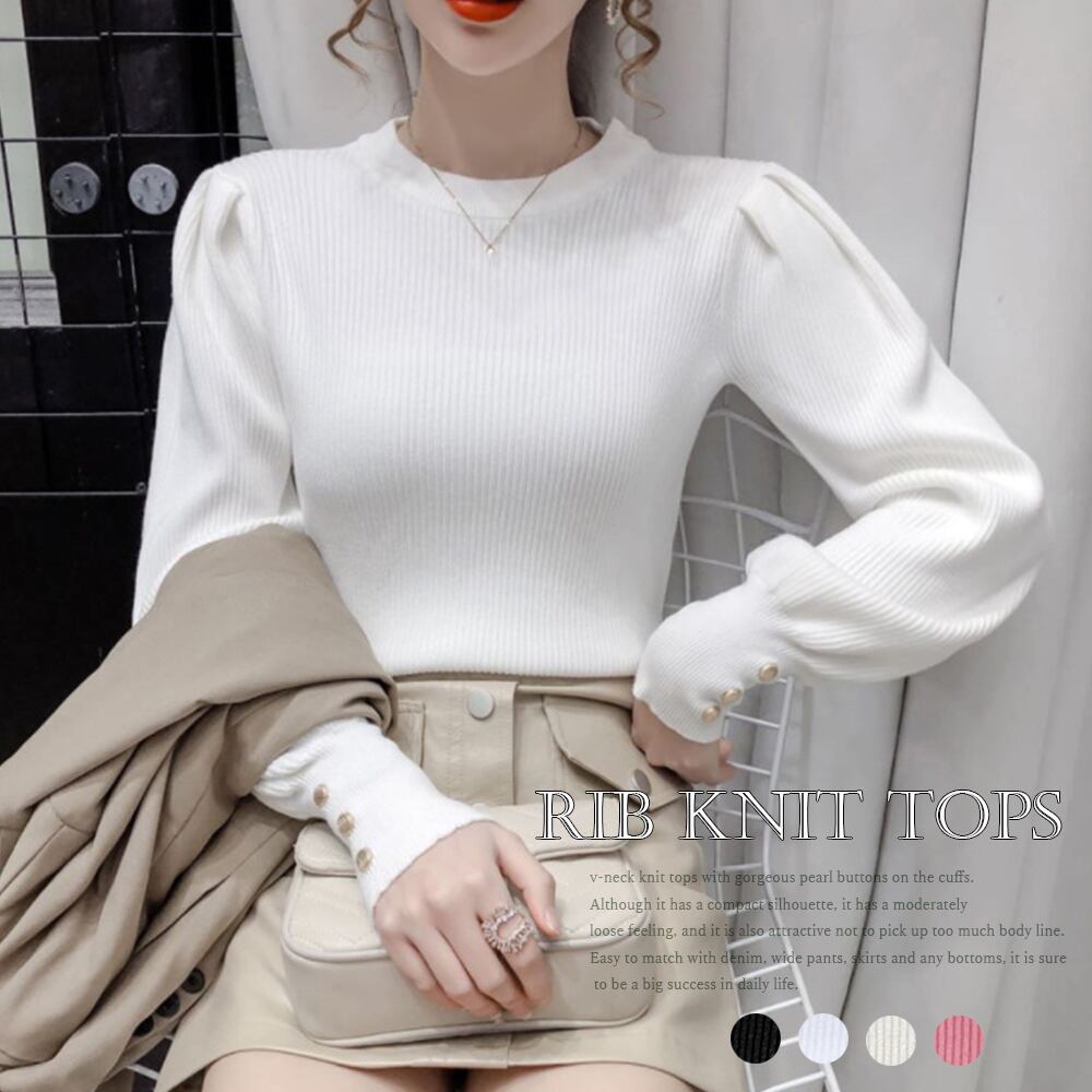 袖口に並んだパールのボタンが華やかなクルーネックニットトップス