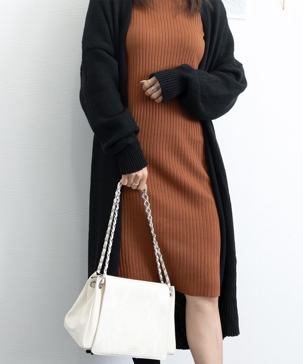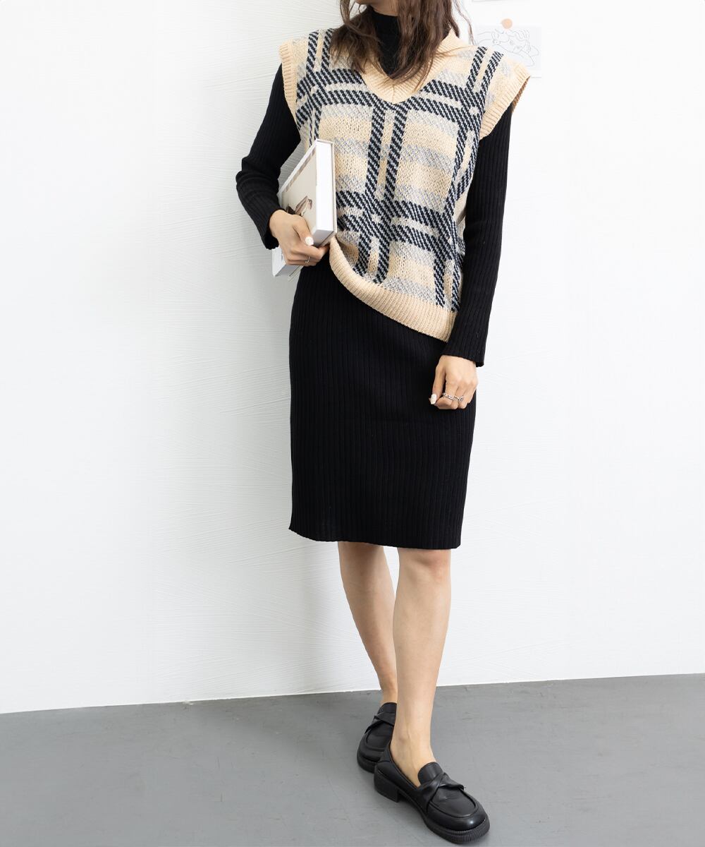 ハイネックデザインで首元が暖かいリブニットワンピース