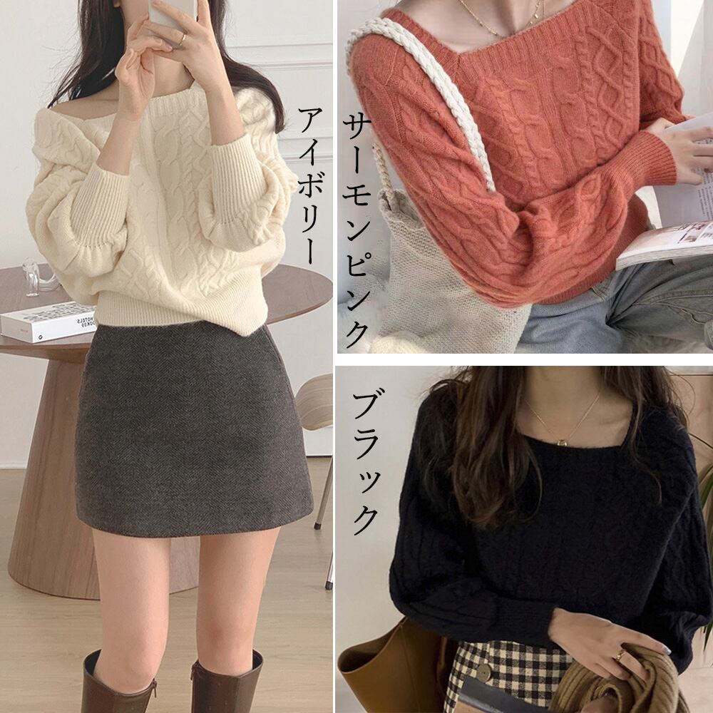 ケーブルニット スクエアネック 韓国風