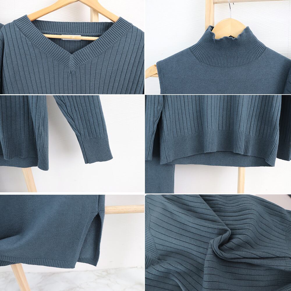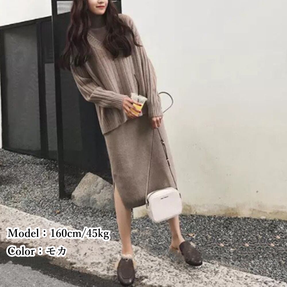 vネック 長袖 セーター ハイネック ワンピース サイド スリット 上下セット 秋冬 きれいめ カジュアル ツーピース