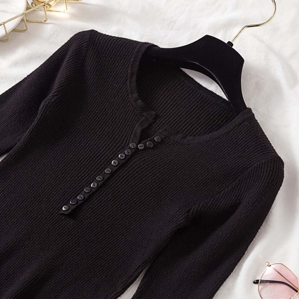 vネック タイトトップス シンプル ニットソー 無地 着回し フロントボタン インナーセーター 秋冬