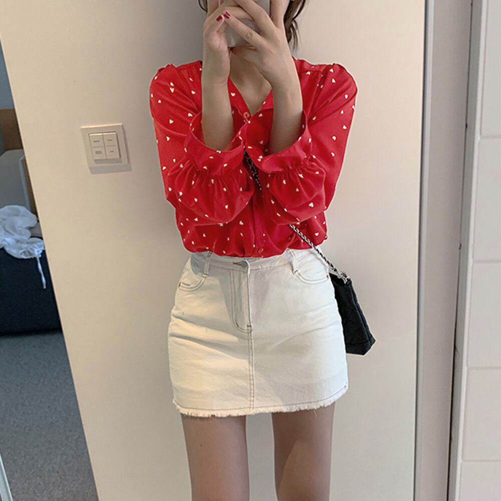小さめのハート柄のプリントはとてもキュートなブラウス