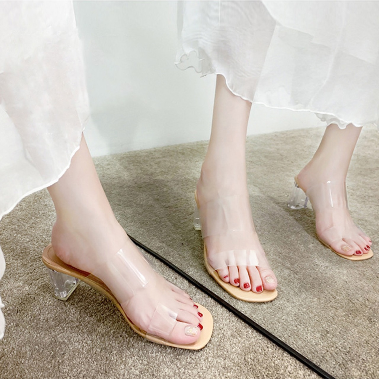 クリアチューブの甲ベルトがポイントのクリアソール太ヒールサンダル
