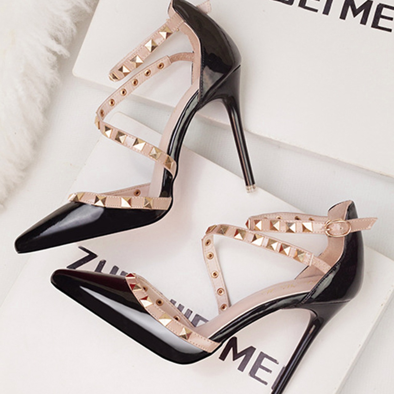 パンプス ハイヒール レディース アンクルストラップ リベット ピンヒール