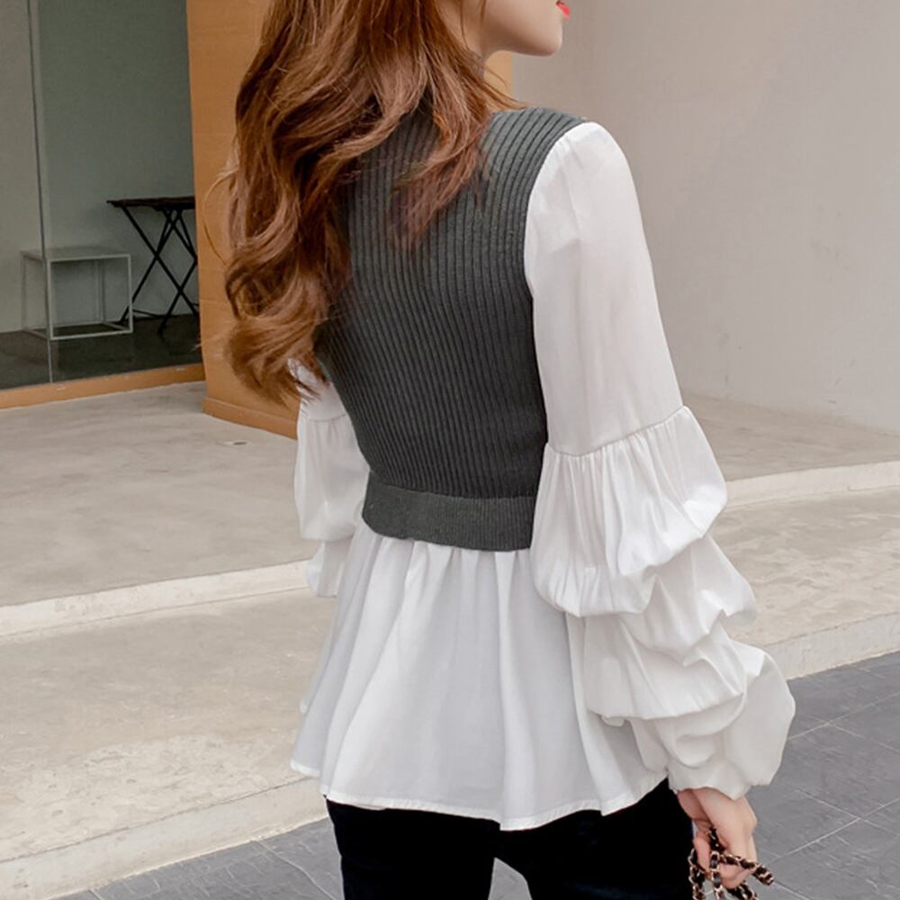 ふんわりボリュームスリーブがクラシカルなブラウスと、ノースリーブニットのレイヤードトップス