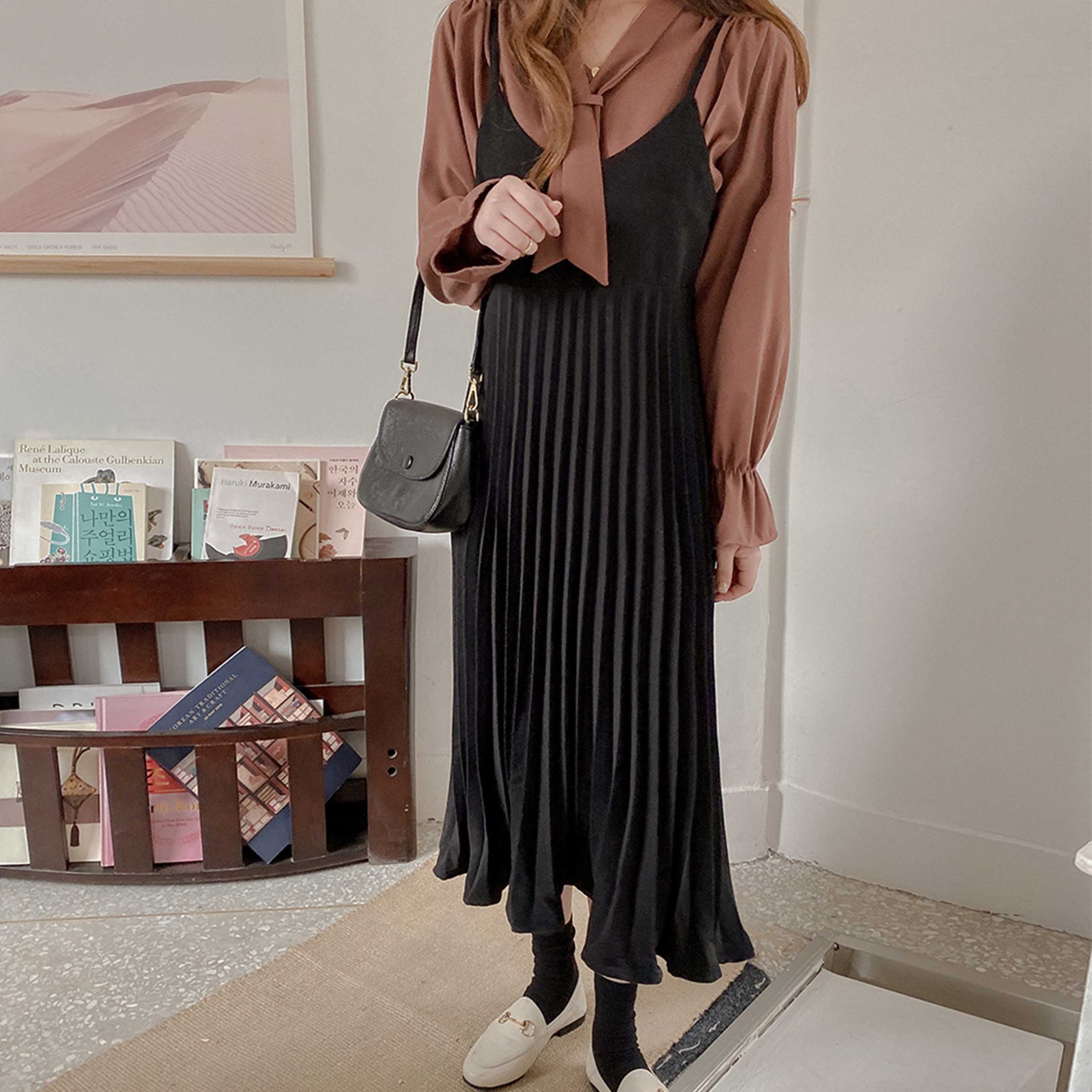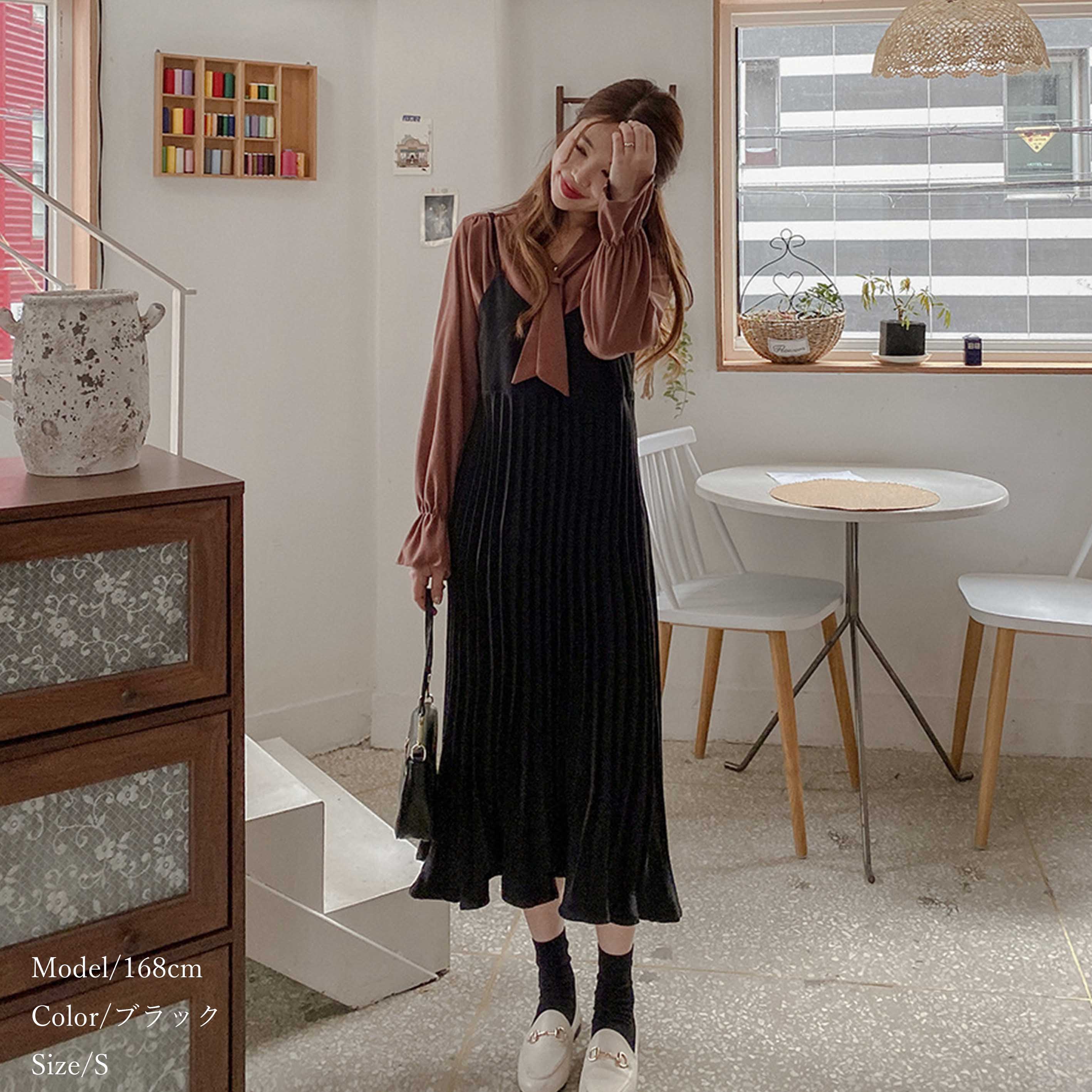プリーツ キャミソールワンピース レディース 重ね着 ロングワンピース 無地
