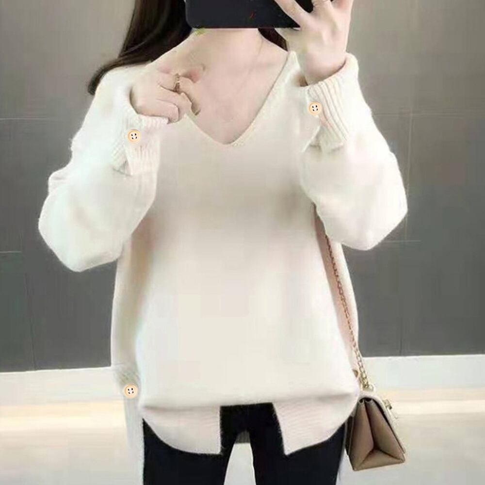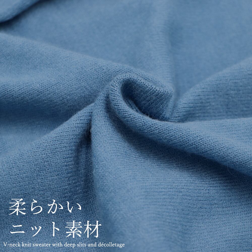 深めのスリットやデコルテがしっかり見えるVネックニットセーター