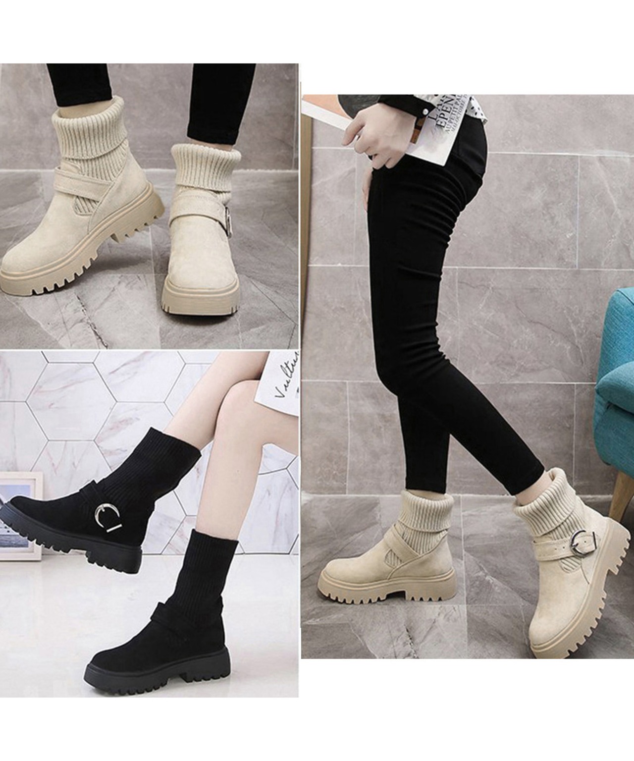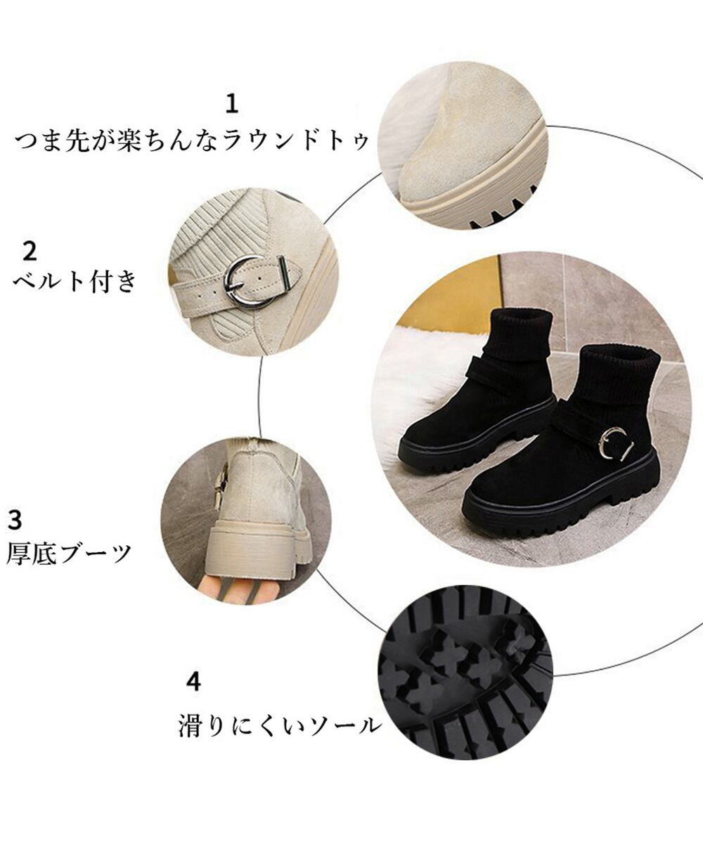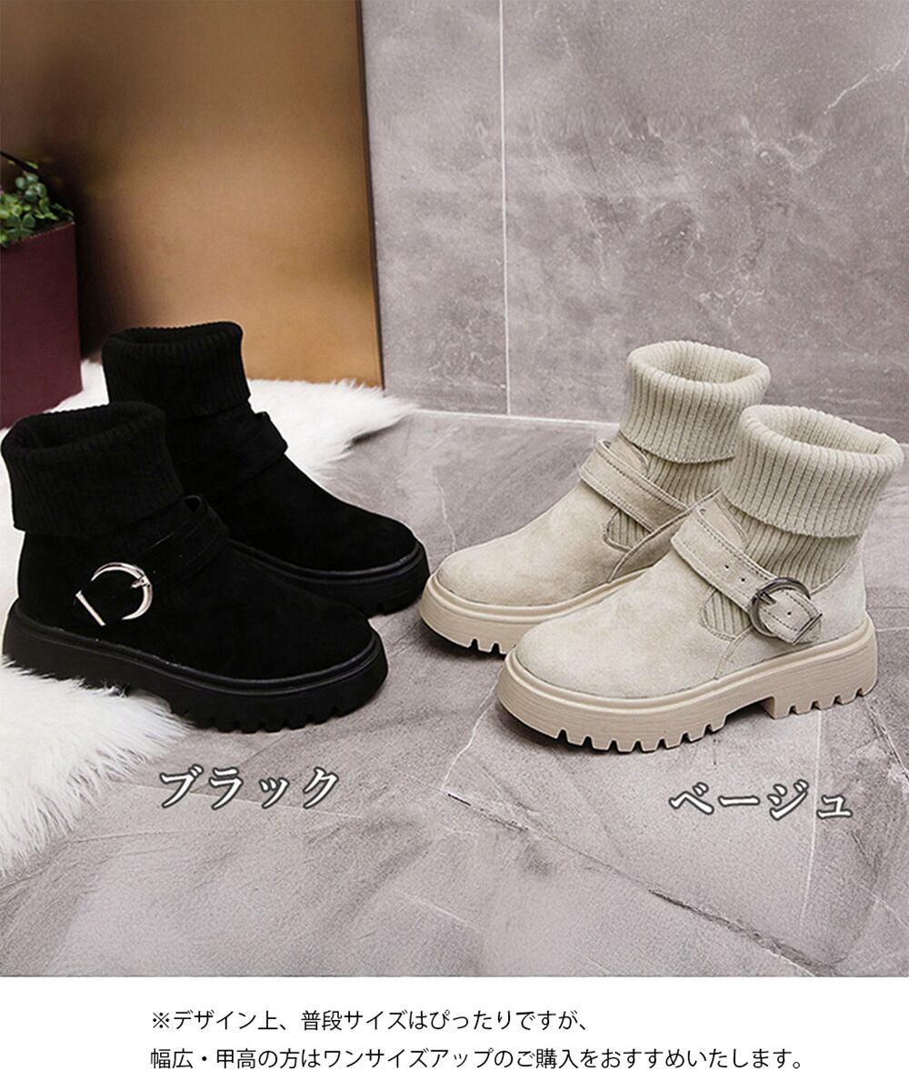 ソックス風 ショートブーツ レディース 2wayニットブーツ バックルベルト 厚底ブーツ  歩きやすい ハイカット