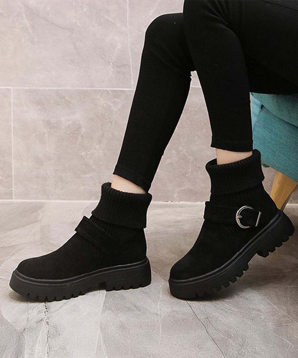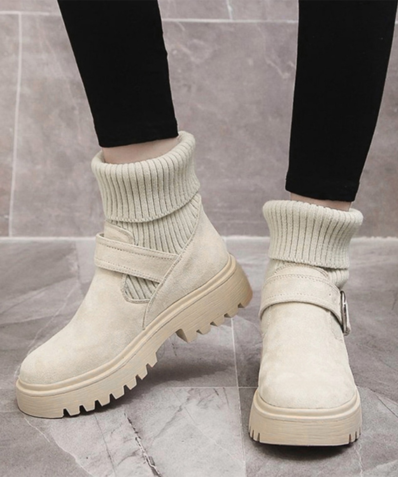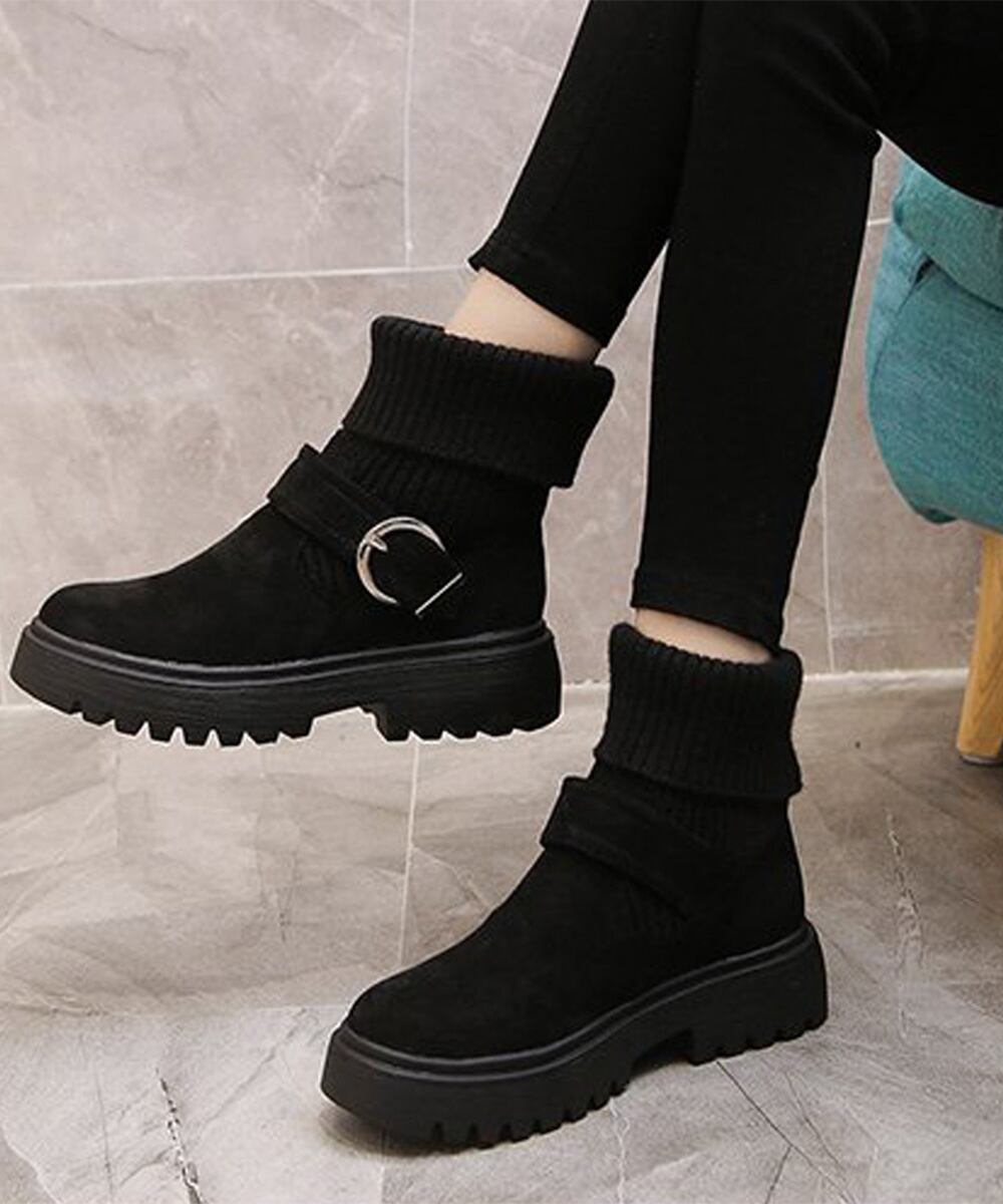 ソックス風 ショートブーツ レディース 2wayニットブーツ バックルベルト 厚底ブーツ  歩きやすい ハイカット