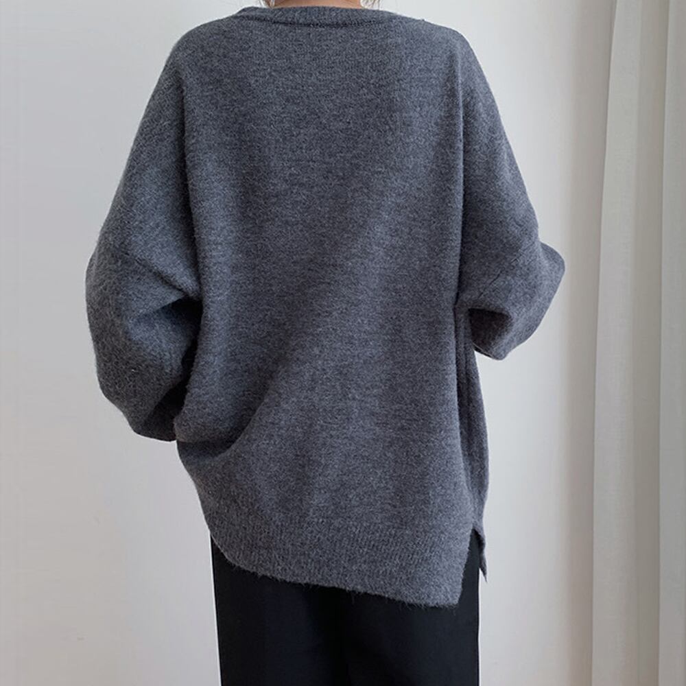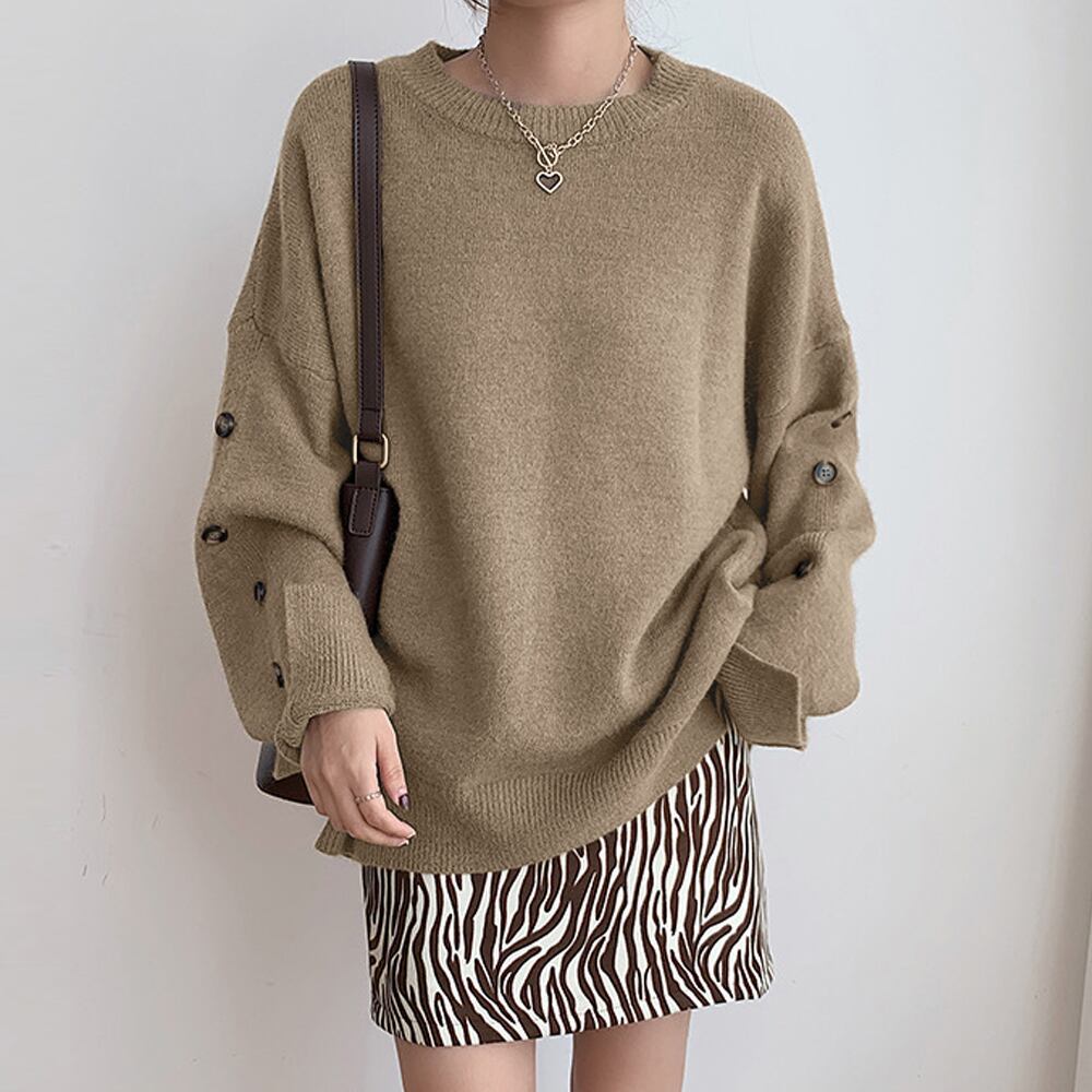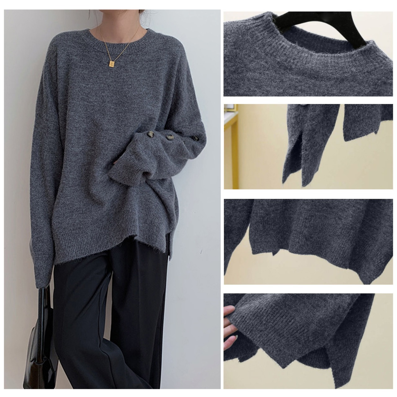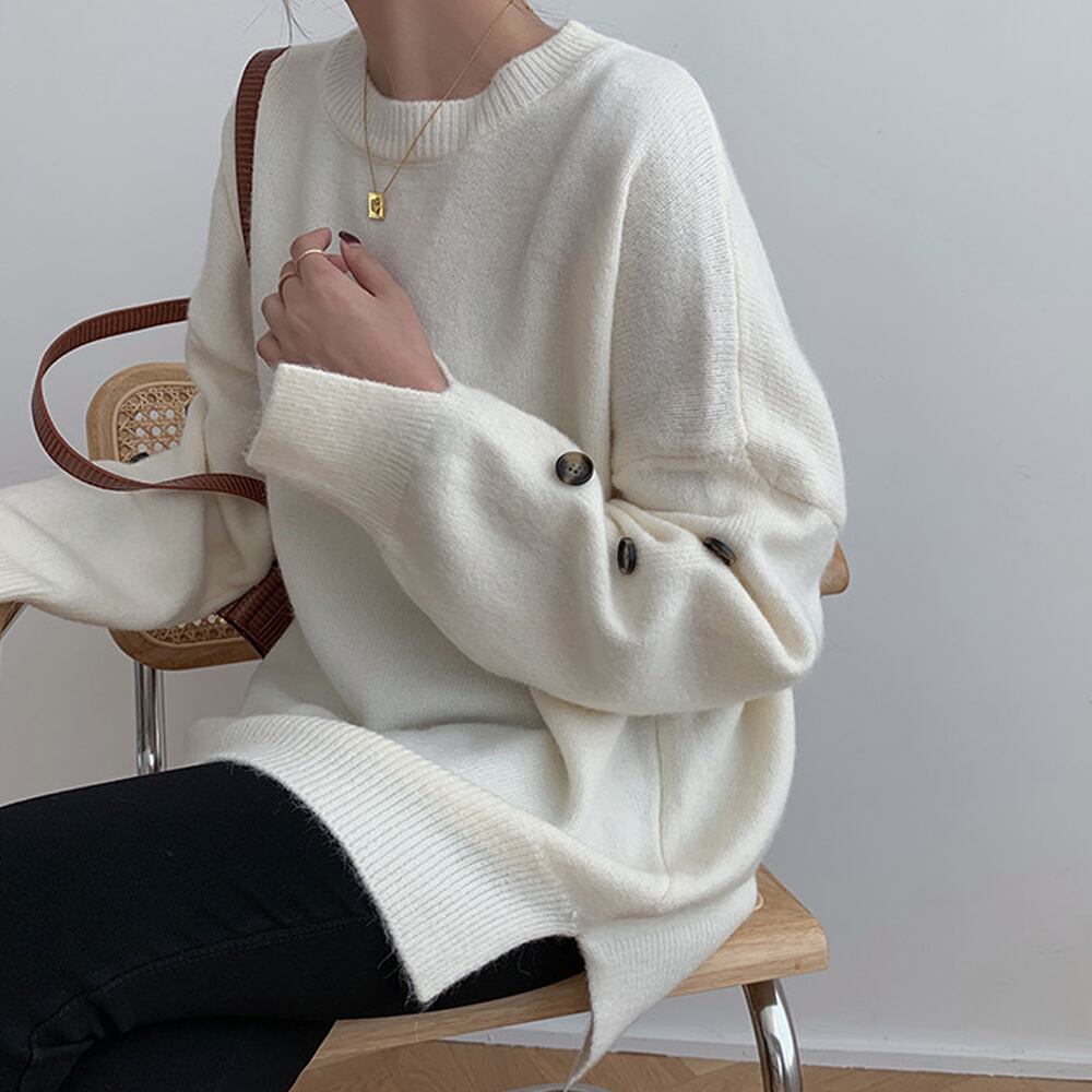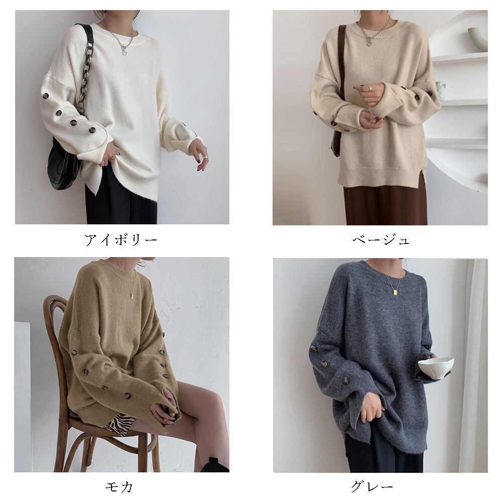ニットセーター レディース スリット入り 袖ボダン クールネック ゆるニット トップス プルオーバー
