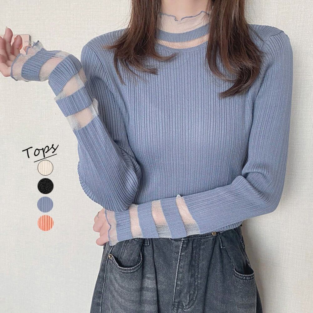 ニットトップス レース プルオーバー 切り替え ニットソー ハイネック