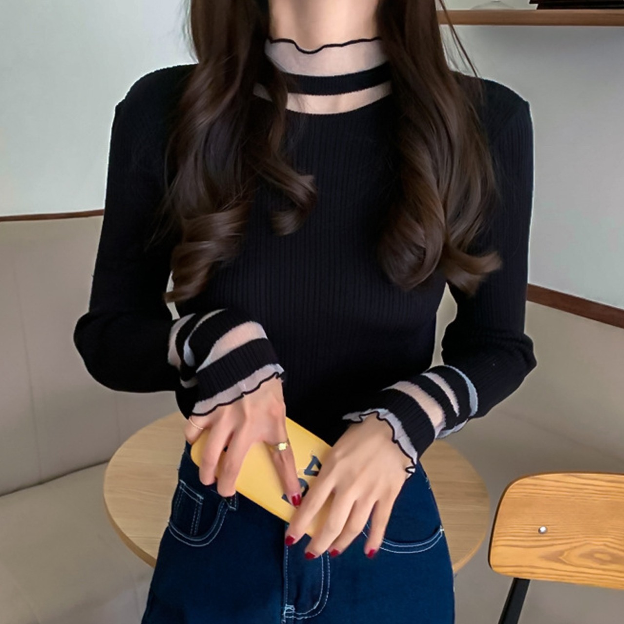 袖と襟にプリーツレースがついたフェミニンなハイネックニットトップスです