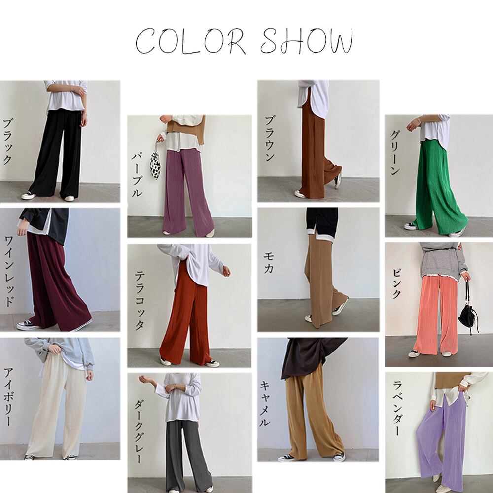 プリーツパンツ レディース カラーパンツ セルフカット大人カジュアル バギーパンツ  リラックス フレアパンツ 全12色