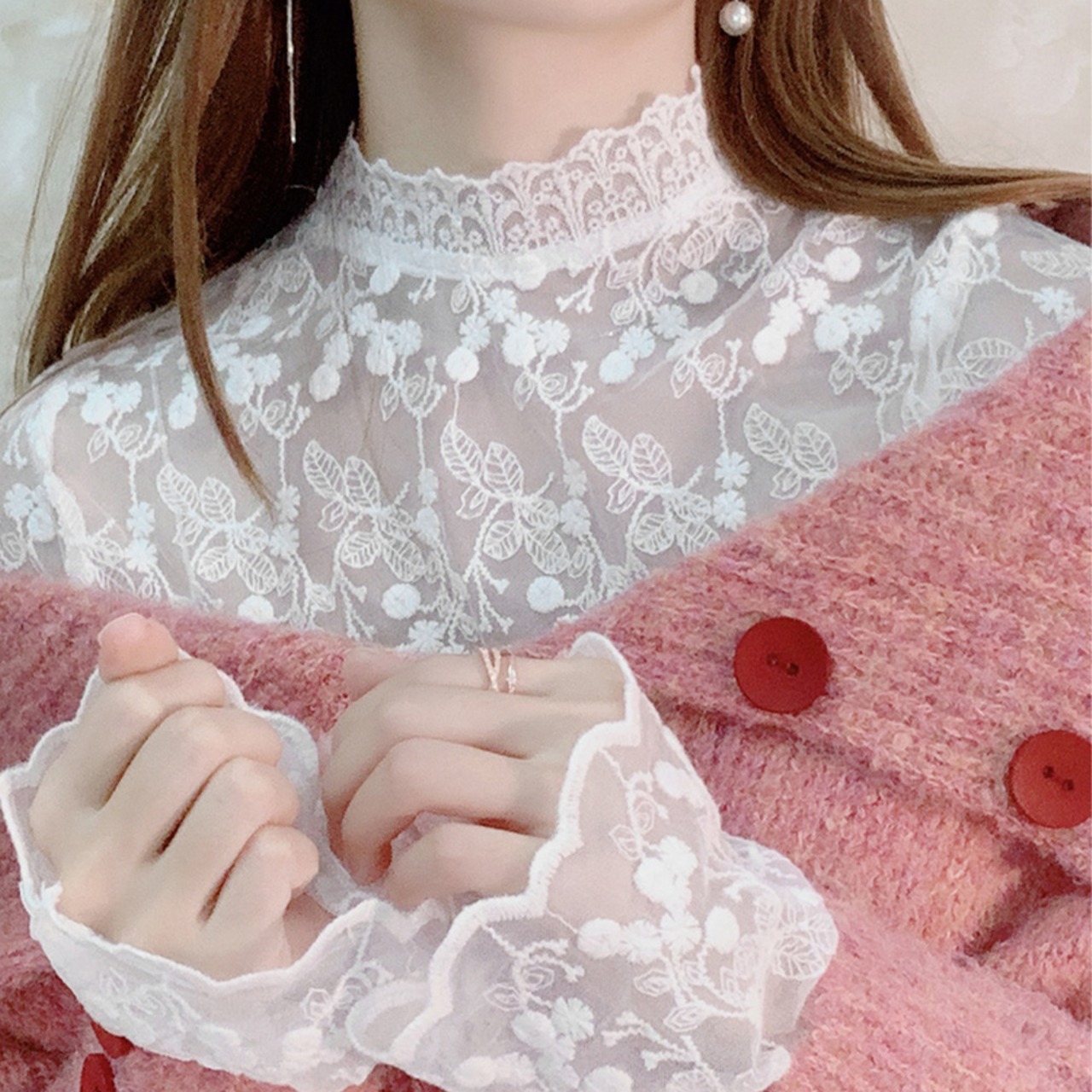 総レースプチハイネックブラウス シアートップスシースルー オシャレ セクシープルオーバー 韓国風 フェミニン重ね着シャツ