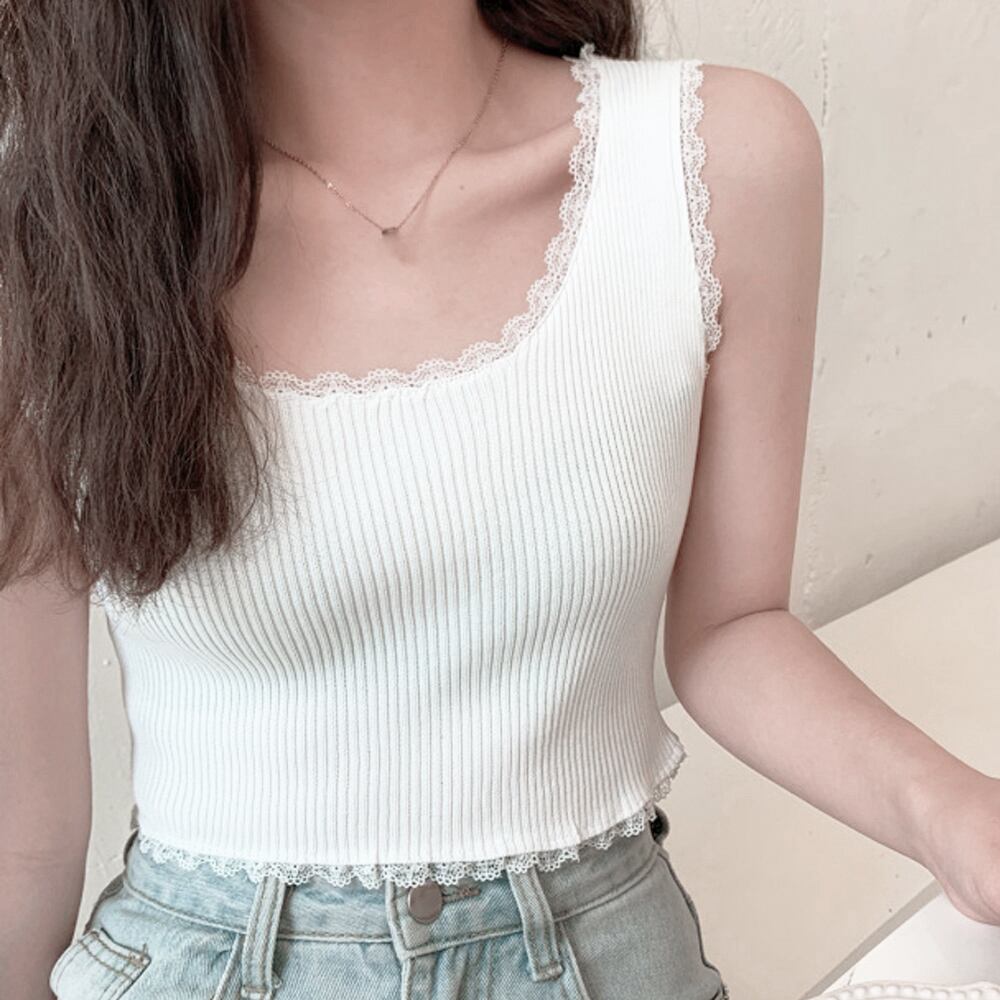 ショート丈 レースキャミソール ラウンドネック インナー 韓国ファッション  重ね着 リブニット