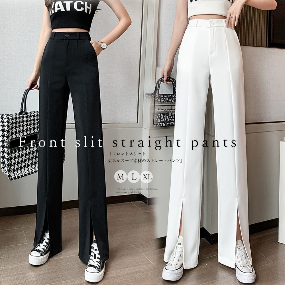 フロント部分にスリットが入った、スタイルアップが期待できる柔らかスーツ素材のワイドパンツ