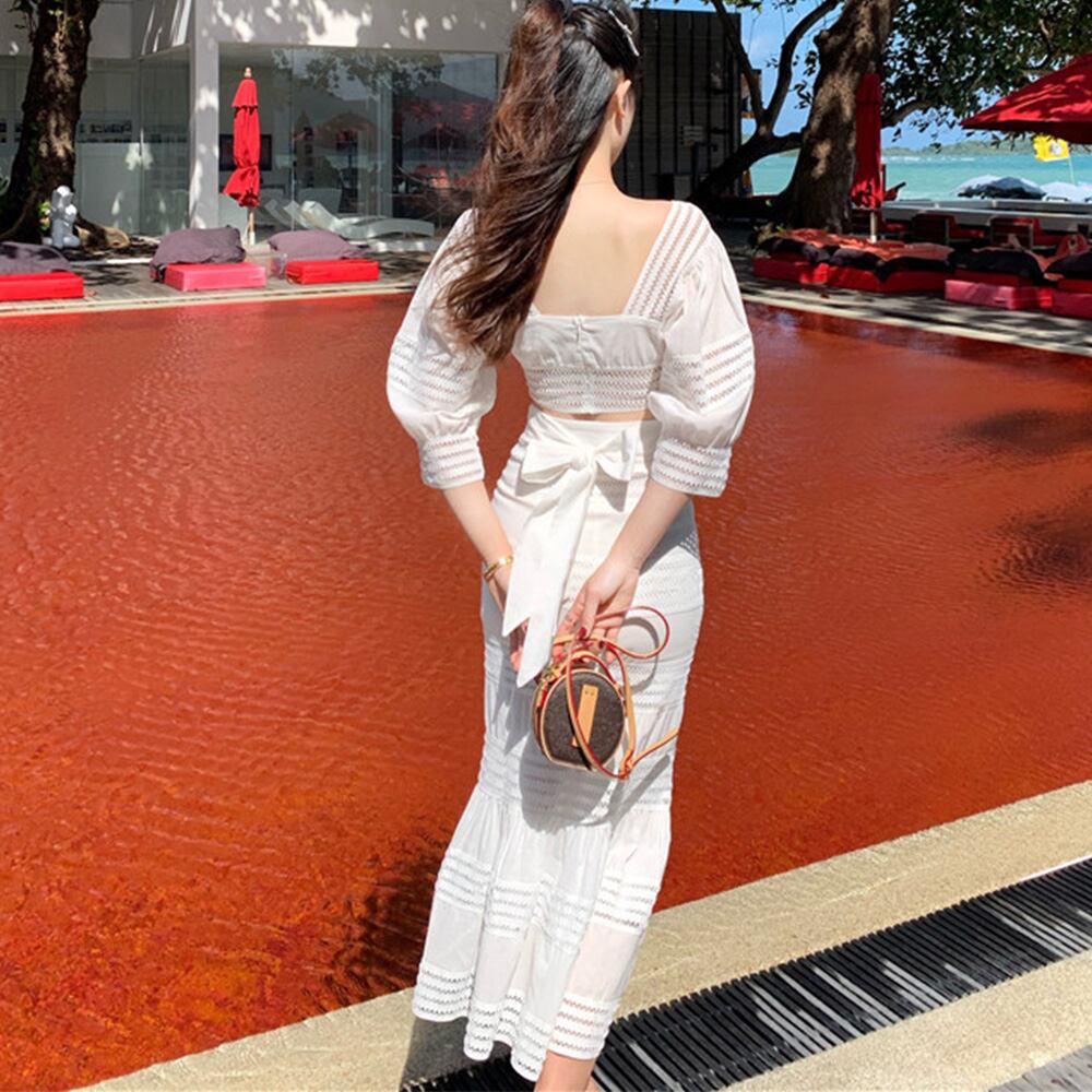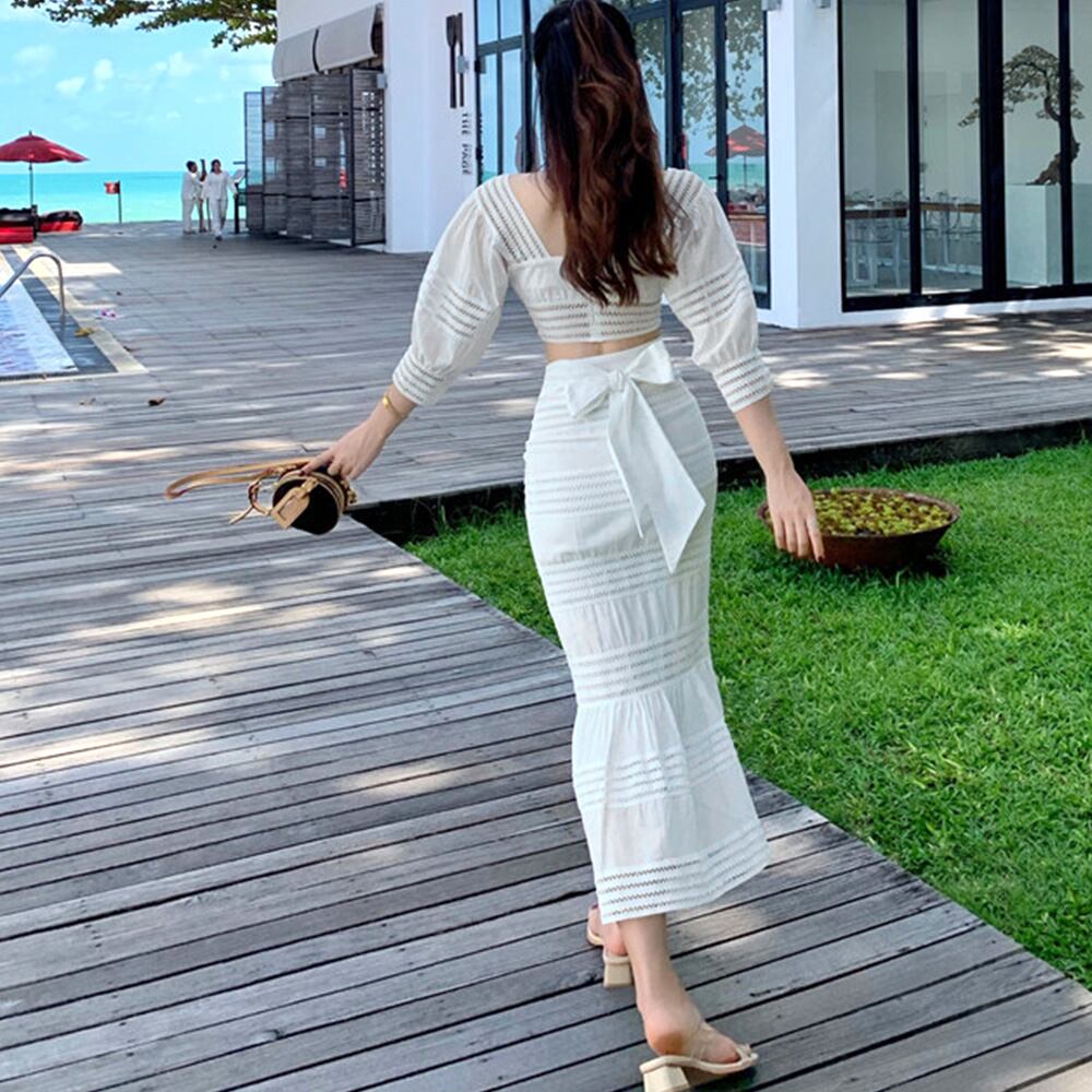 ショート丈 トップス ハイウエスト ロングスカート 上下セット スクエアネック ブラウス リゾートドレス リゾート 春夏 背中あき へそ出し バックリボン高みえ
