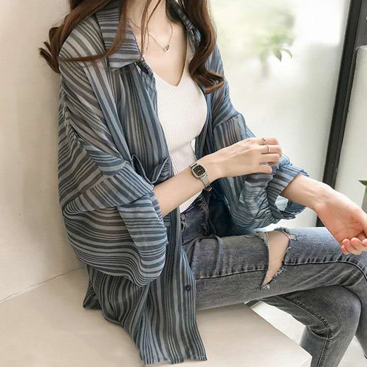 ストライプ ブラウス 大きいサイズ パフスリーブ UV対策 人気 オフィスカジュアル おしゃれ 着やせ OL シースルー
