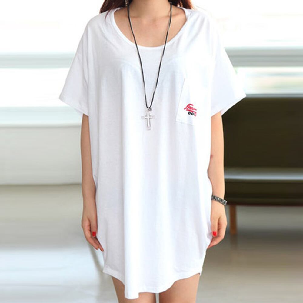 ゆったり ラウンドネック ロゴTシャツ レディース 無地カットソー プルオーバー 体型カバー 着やせチュニックワンピ韓国