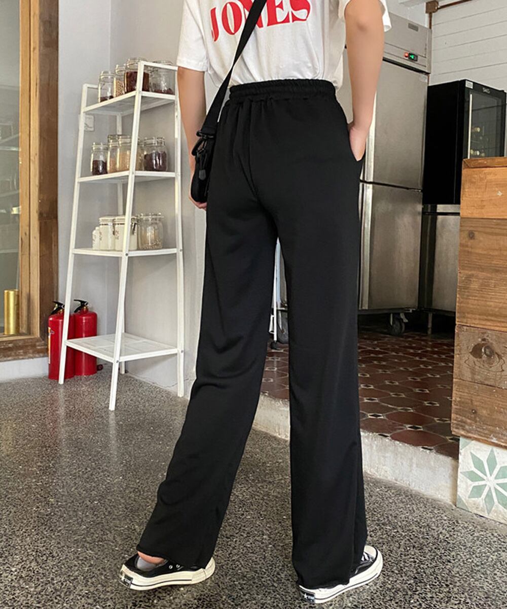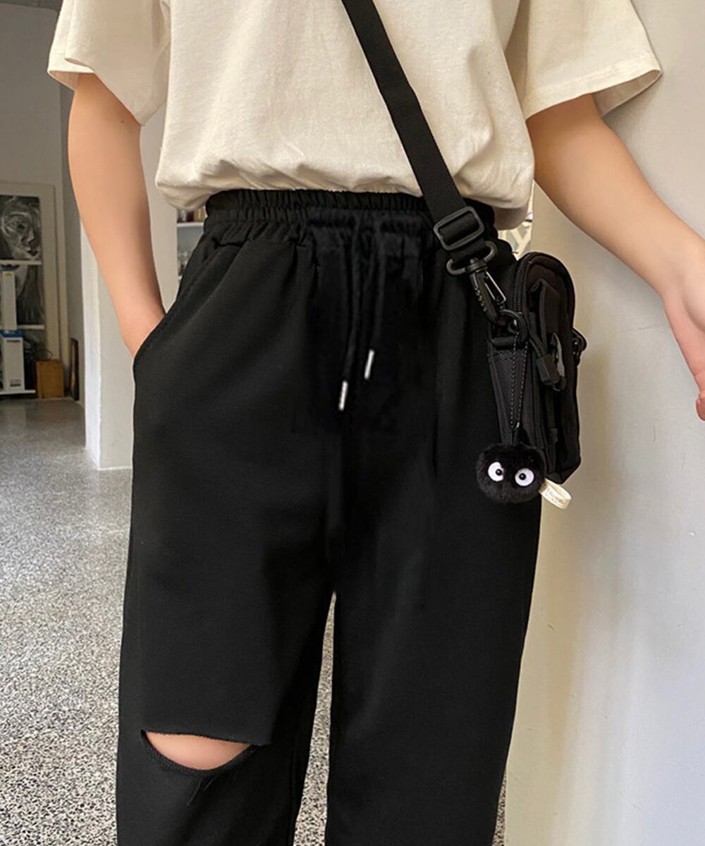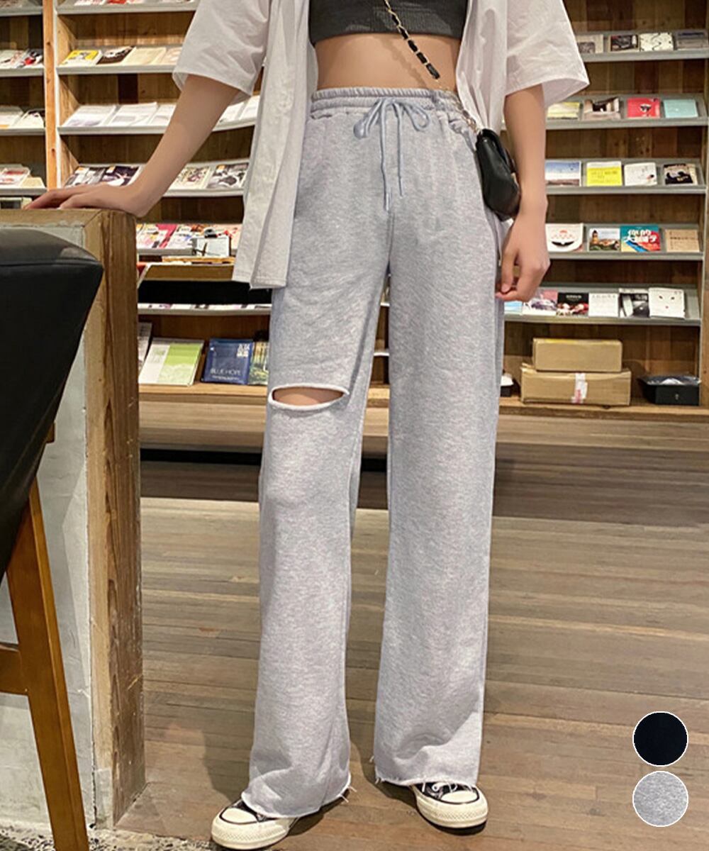 韓国 穴あき スエットロングパンツ ウエストゴム イージーパンツ カジュアル リラックス ストレートパンツ 着やせ