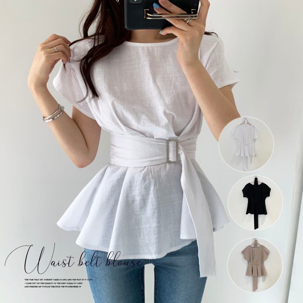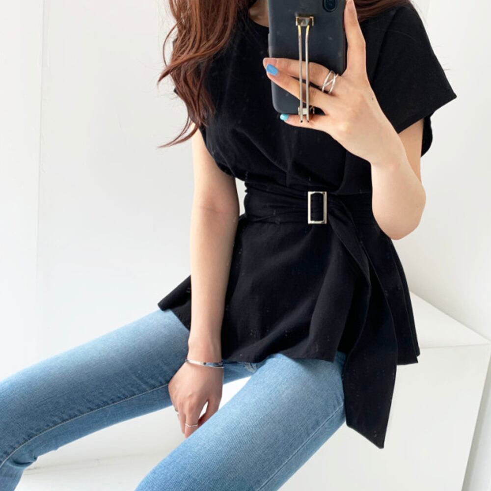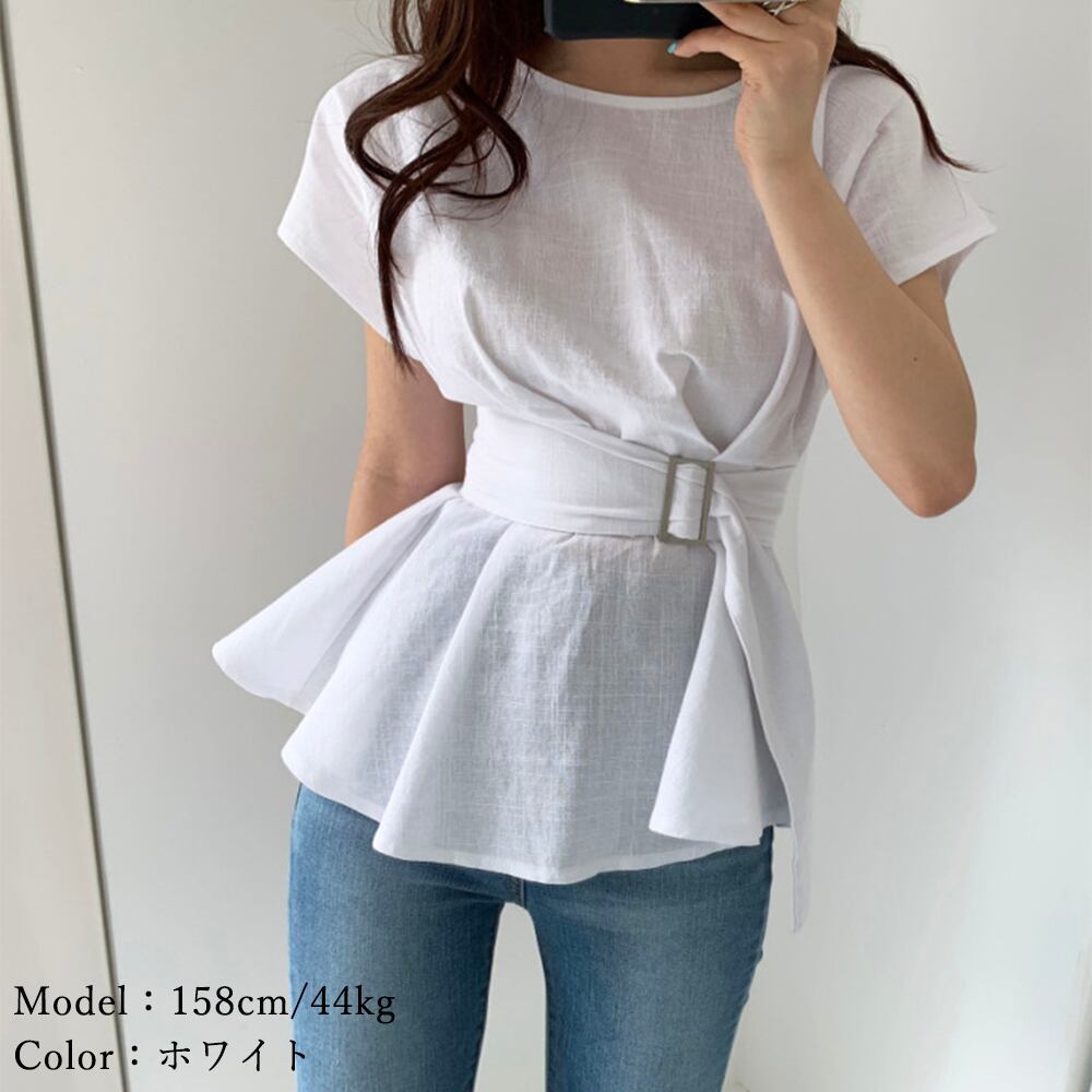 ウエストマーク ミドル丈シャツ 半袖プルオーバー おしゃれ 無地トップス クルーネック 大人かわいい 夏服 OL 上品