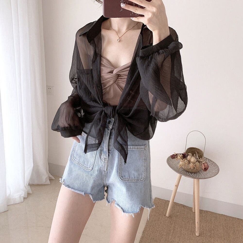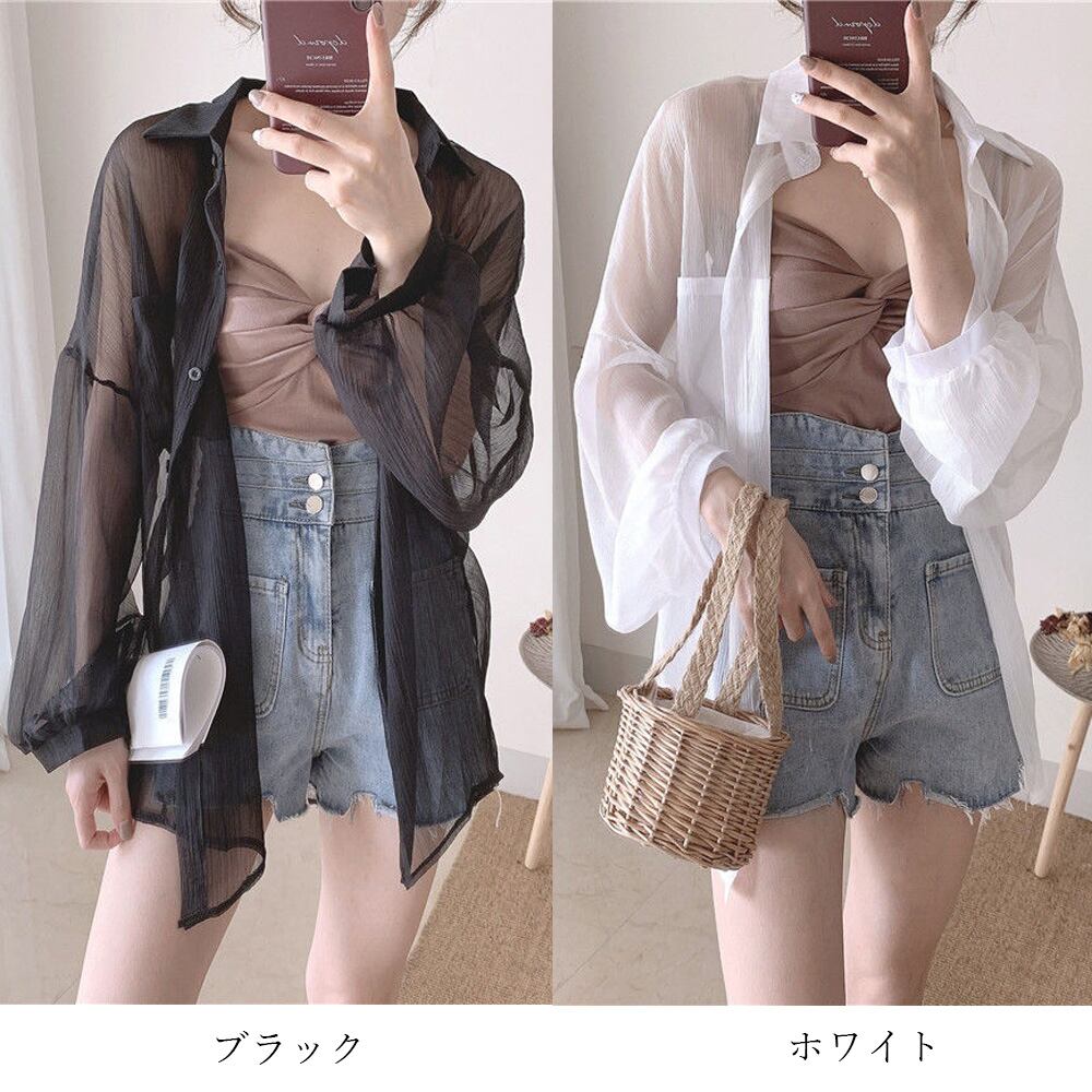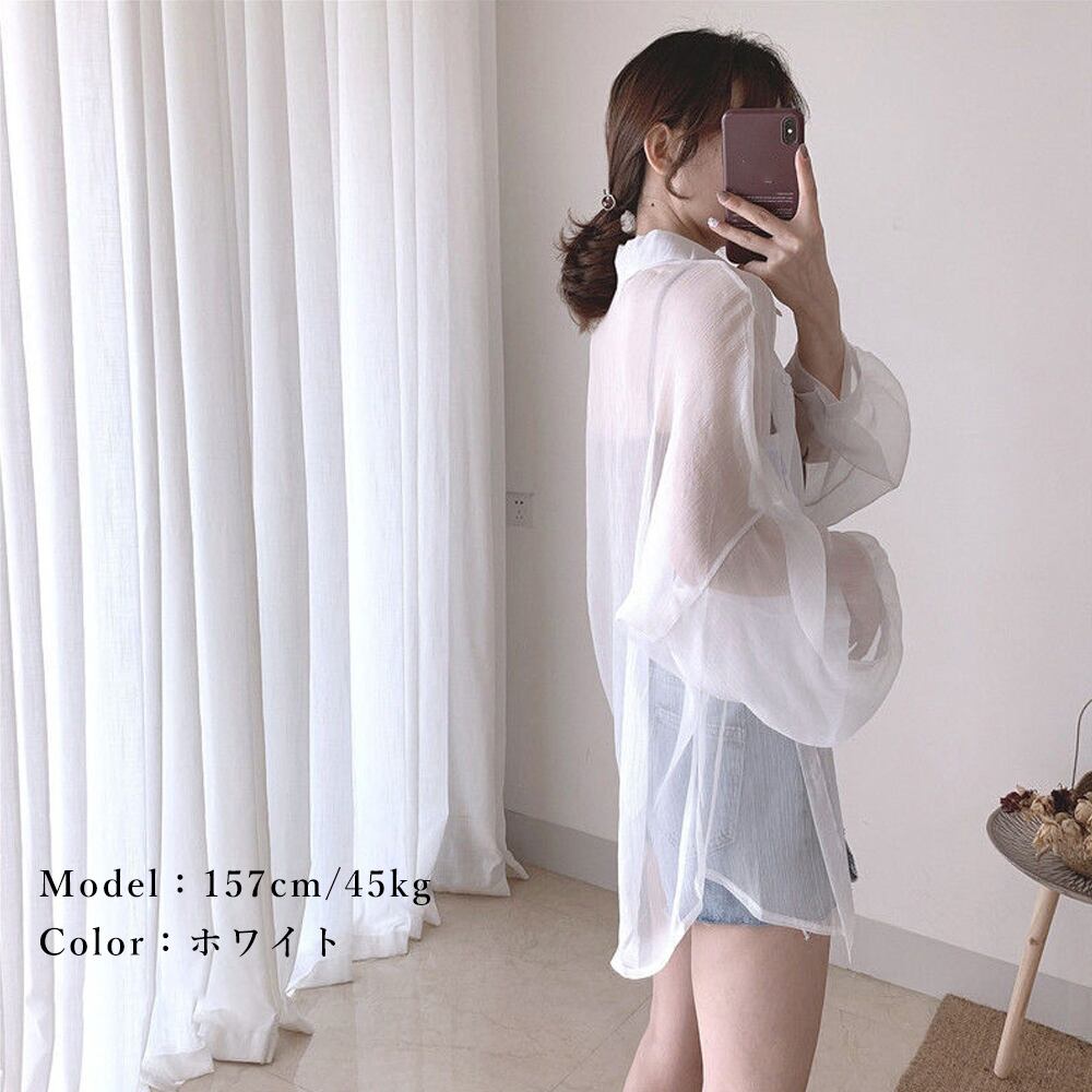 レディース シフォンカーディガン 薄手 シースルーシャツ ボリュームスリーブ 羽織 無地 韓国 透け感 ブラウス