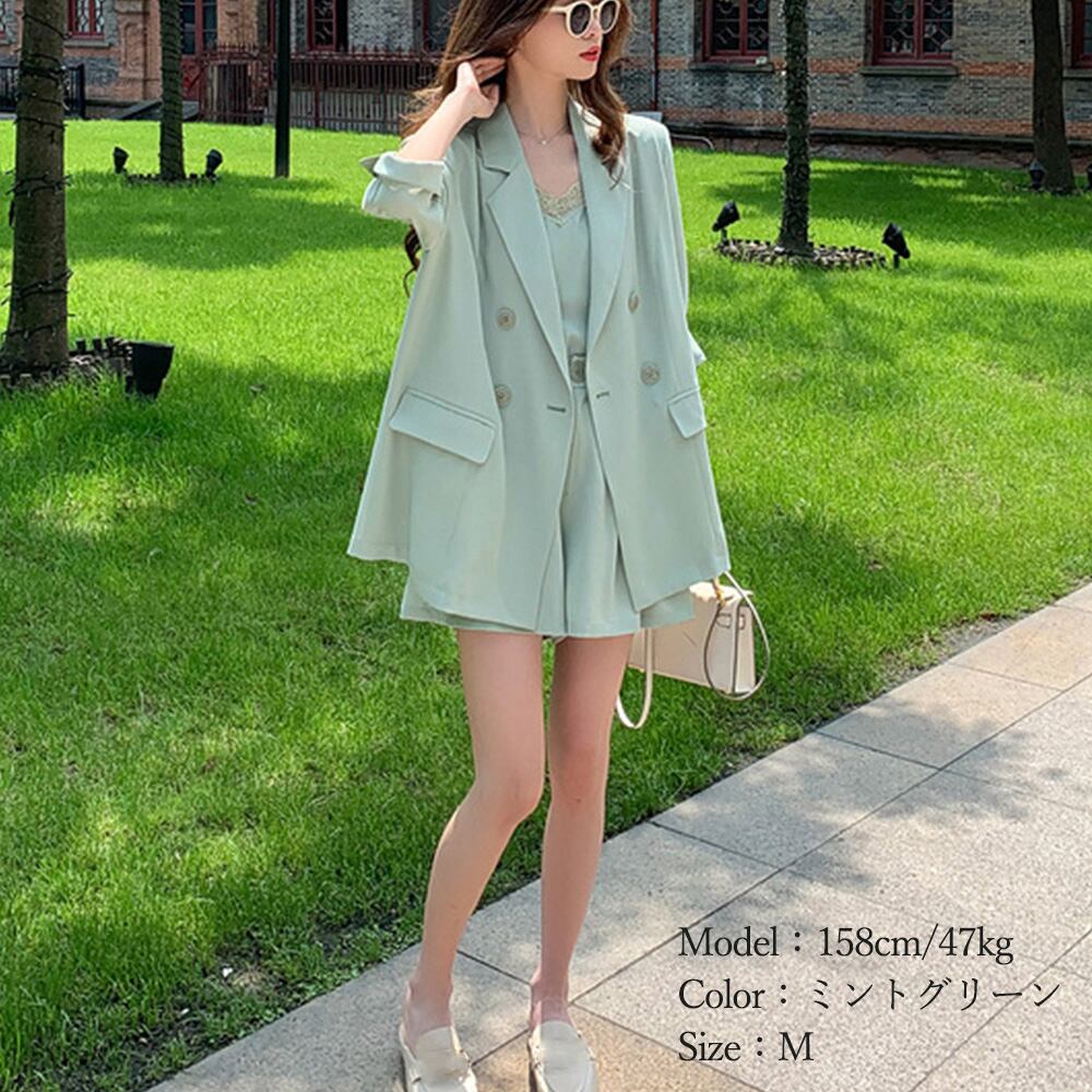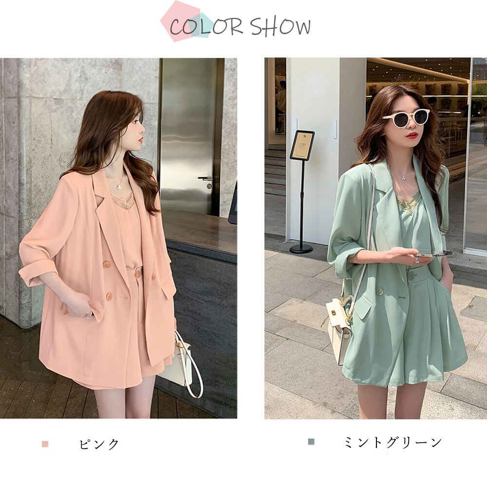 上下3点セット 長袖 ジャケット 春夏 Vネック レース キャミソール ウエストゴム ショートパンツ OL通勤 着やせ